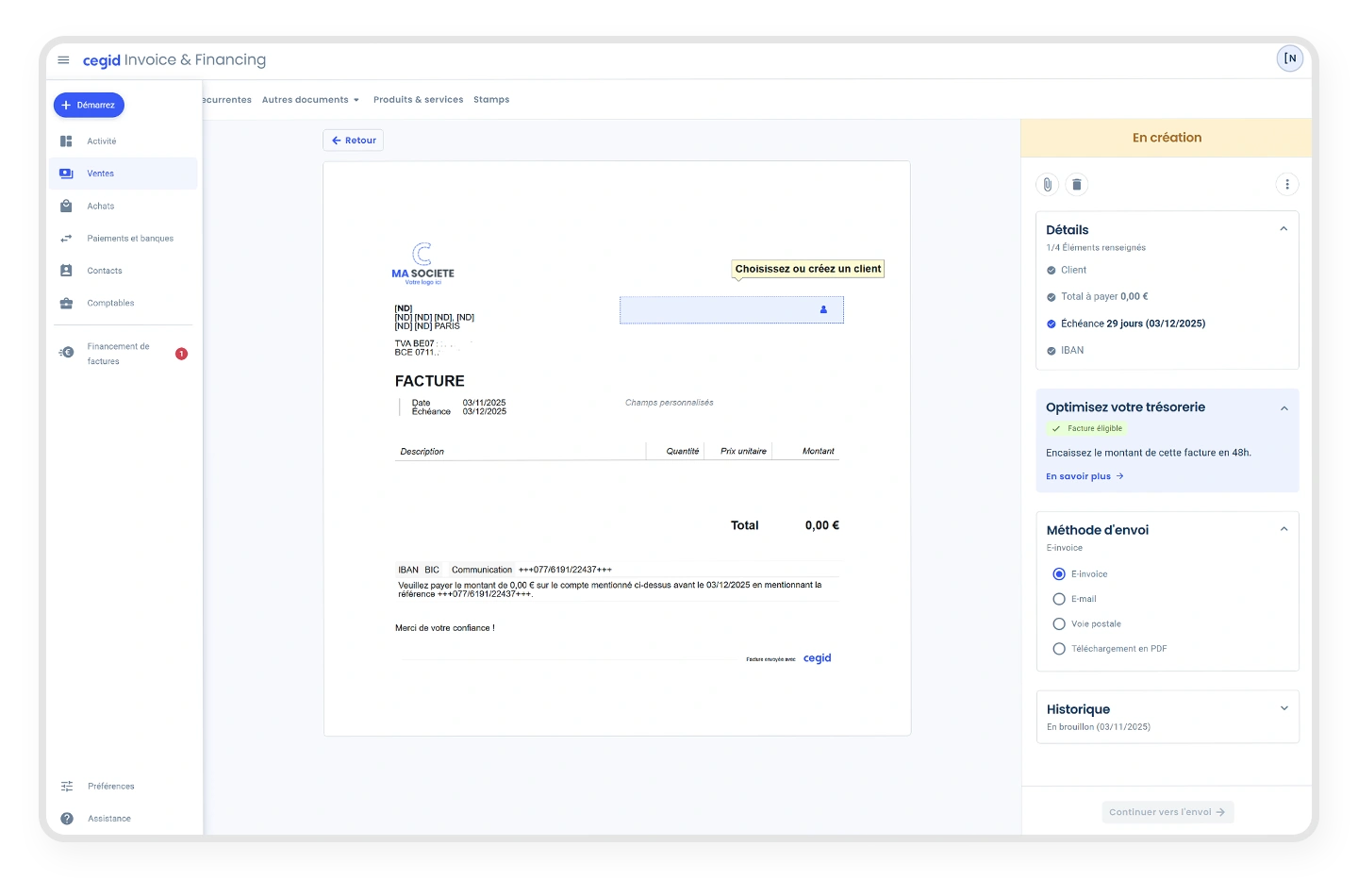 Créez votre facture depuis Cegid Invoice & Financing et demandez-en le financement en un clic. Nous payons votre facture sous 48h. A échéance, votre client paye sa facture. C’est simple et rapide !