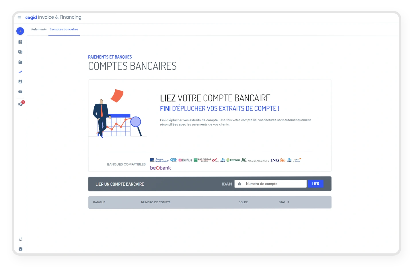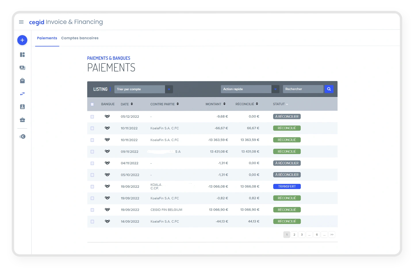 Connectez vos comptes bancaires à Cegid Invoice & Financing et accédez à tous vos comptes sur une seule interface. Faites le point sur vos mouvements bancaires facilement, retrouvez une transaction en un instant ou pilotez votre trésorerie aisément. Pour chaque facture payée, la réconciliation bancaire se fait automatiquement. De quoi vous faire gagner du temps !