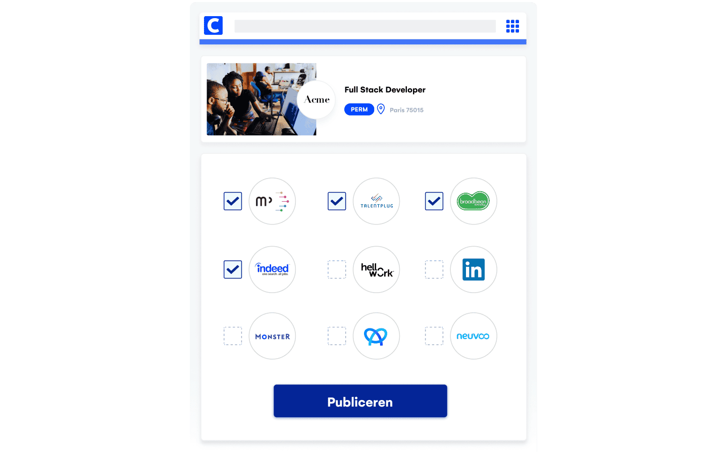 Je team kan nu vacatures plaatsen in slechts een paar klikken. Kies een sjabloon, selecteer het type functie, pas de vacature aan en deel deze direct op Indeed, LinkedIn en meer dan 3.500 andere vacaturewebsites. Een vacature plaatsen is nog nooit zo makkelijk geweest.