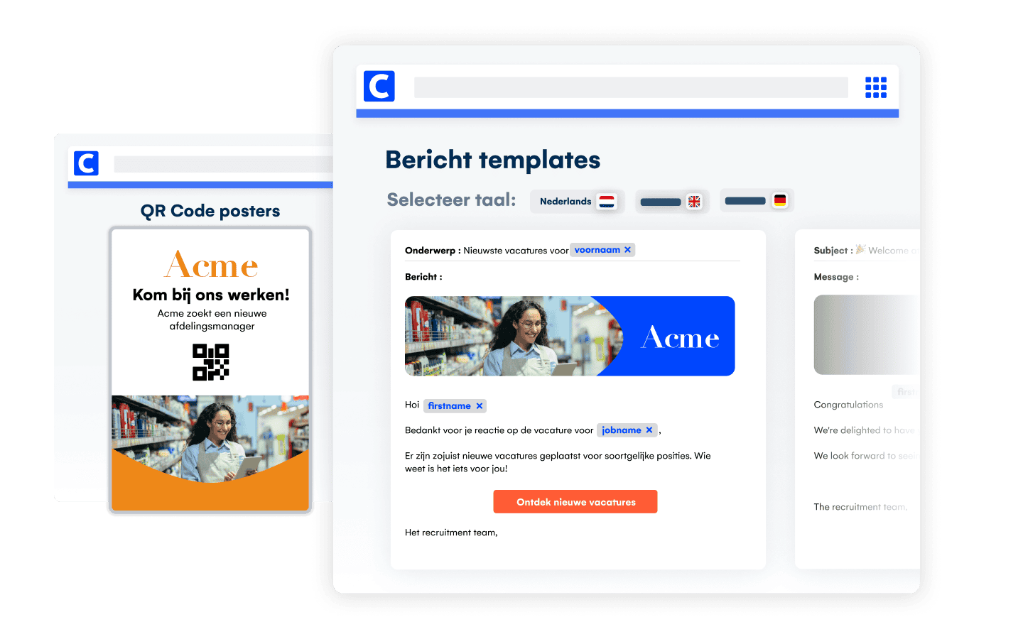 Bereik heel gericht de juiste kandidaten via de meest geschikte kanalen: e-mail, offline en gerichte advertenties (via onze partners met directe koppelingen). Verstuur gepersonaliseerde marketingmails naar specifieke doelgroepen, of maak posters met QR-codes voor lokale werving, evenementen en bijeenkomsten.