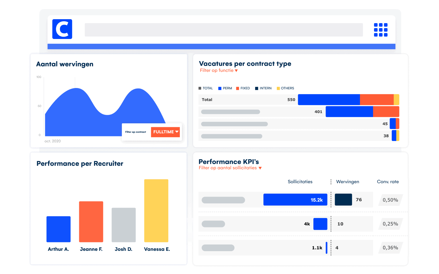 Krijg uitgebreide rapporten om je wervingsproces te volgen, de bron van cv’s te analyseren en te filteren op bijvoorbeeld diversiteit en type contract. Onze analysemodules geven je volledig inzicht in je organisatie en helpen je om je investeringen en processen te verbeteren.