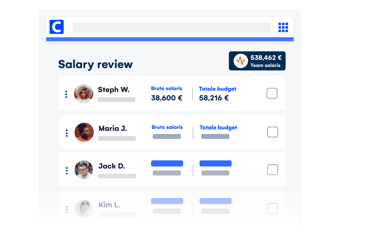 Koppel salarisbeoordelingen aan je budget en de prestaties van je medewerkers. Met duidelijke salaristabellen, ratio’s en benchmarks kunnen managers eerlijke en transparante beslissingen nemen. Zo beloon je medewerkers passend voor hun harde werk, wat niet alleen hun motivatie en loyaliteit verhoogt, maar ook zorgt voor een positieve werksfeer.