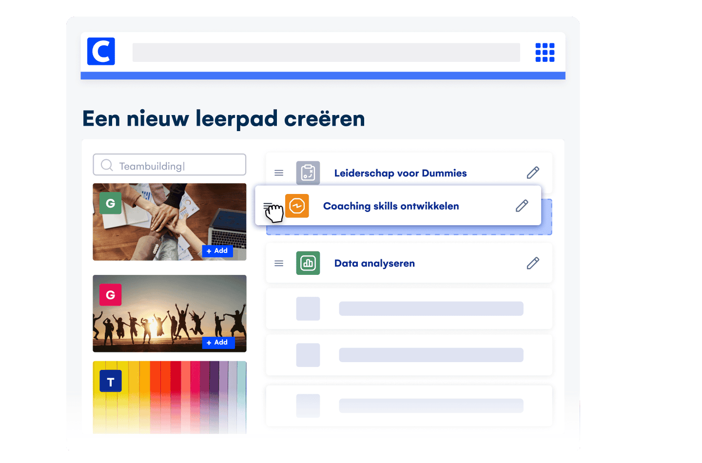 Hergebruik bestaande content en bespaar tijd bij het creëren van nieuwe trainingen. Je medewerkers kiezen zelf de cursussen die hen helpen met het ontwikkele van nieuwe vaardigheden, precies wanneer het hen uitkomt. Met kant-en-klare content groeien ze verder zonder tussenkomst van een learning manager.