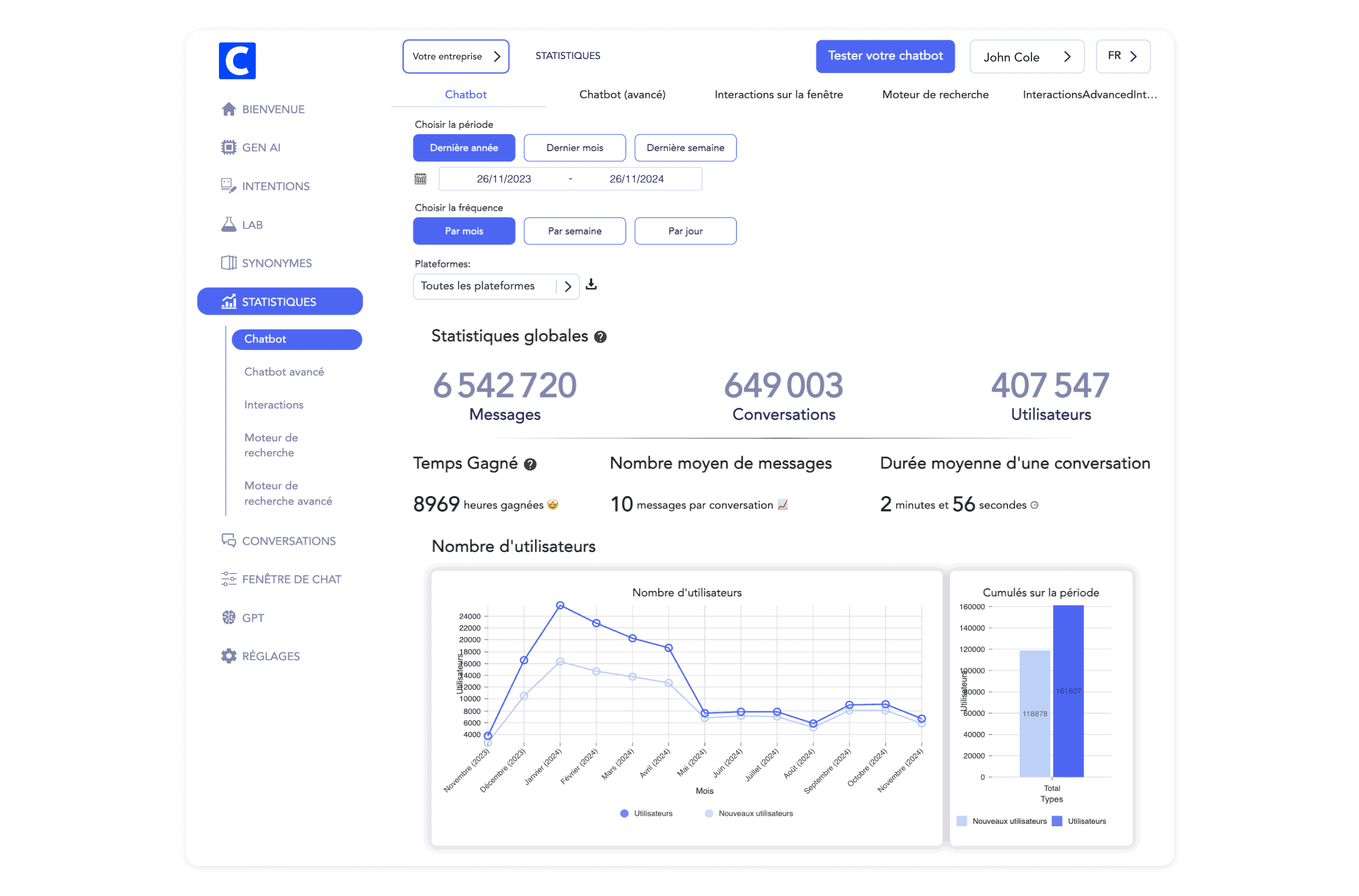 Des données précieuses se cachent dans chaque échange avec vos candidats : nombre de conversations, temps moyen, villes, métiers recherchés… Trackez-les avec la console back-office. Vous pourrez mesurer votre ROI, éditer des réponses multi-formats et suggérer du contenu.