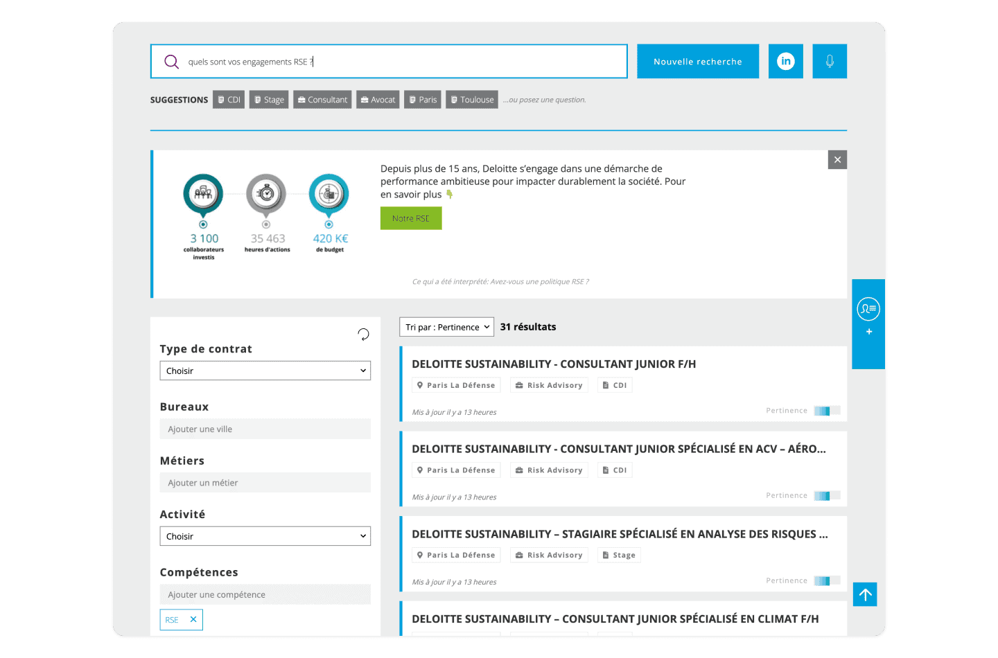 En plus d’assister les candidats dans leur recherche d’emploi, notre moteur de recherche répond à toutes leurs questions en quelques secondes, dans plus de 35 langues, à l’écrit ou en vocal. Comme il est intelligent, il offre des résultats basés sur la géolocalisation et les compétences recherchées, garantissant ainsi une grande efficacité opérationnelle.