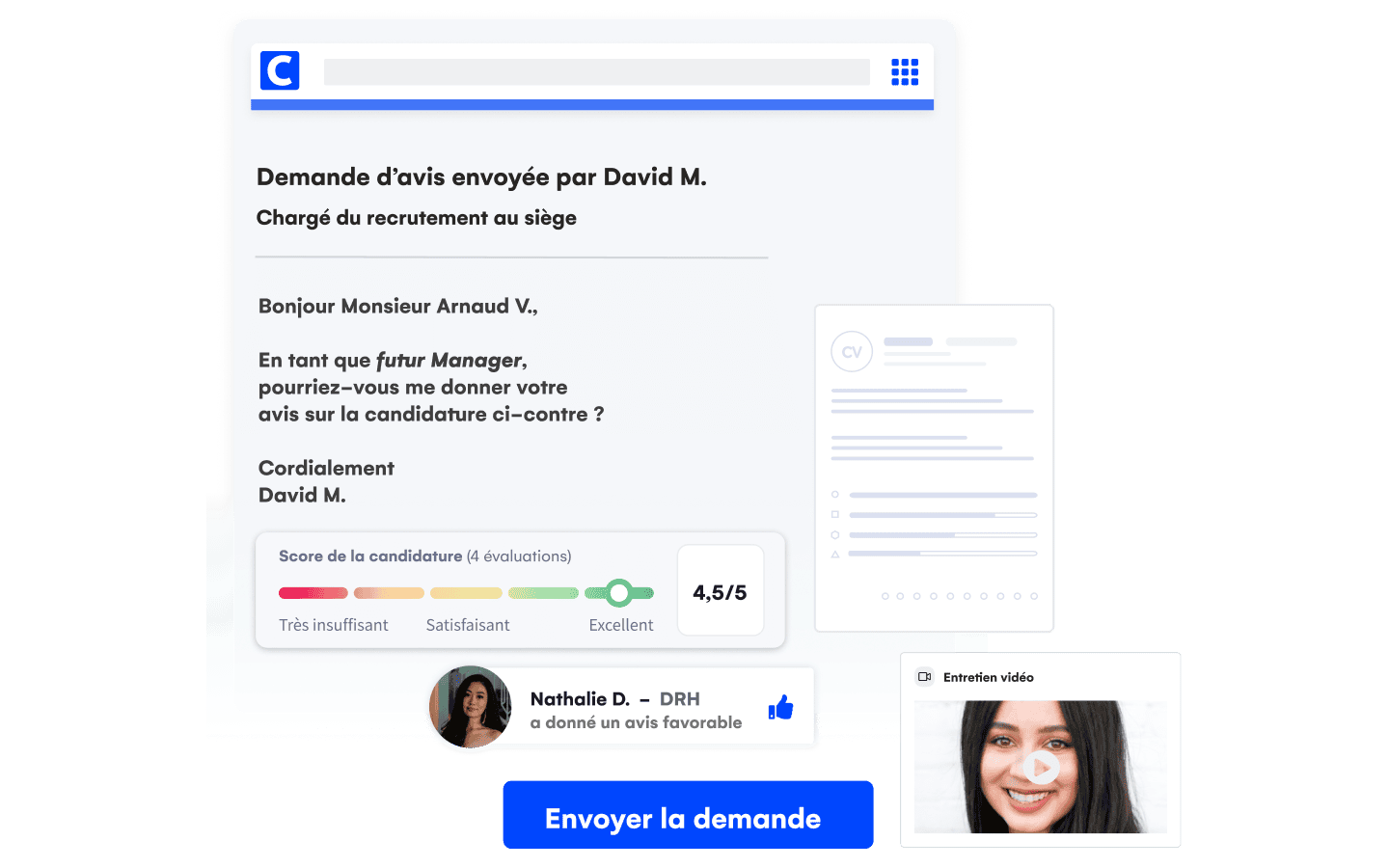 Sollicitez les personnes impliquées dans un recrutement, partagez-leur vos commentaires, entretiens vidéos ou tests, et accélérez le processus de décision. Tous les échanges sont centralisés et accessibles pour avancer de concert. Mieux, vous n’avez même pas besoin de compte, un simple partage suffit.