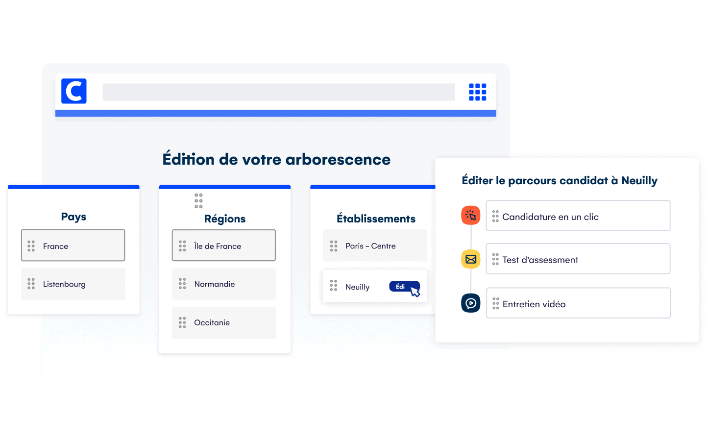 En quelques clics, modélisez votre organisation et activez des parcours candidat personnalisés par entité, poste et bassin d’emploi. Pour chaque contexte, définissez les informations requises, configurez votre questionnaire et proposez le bon format d’entretien (physique, vidéo live et différé).