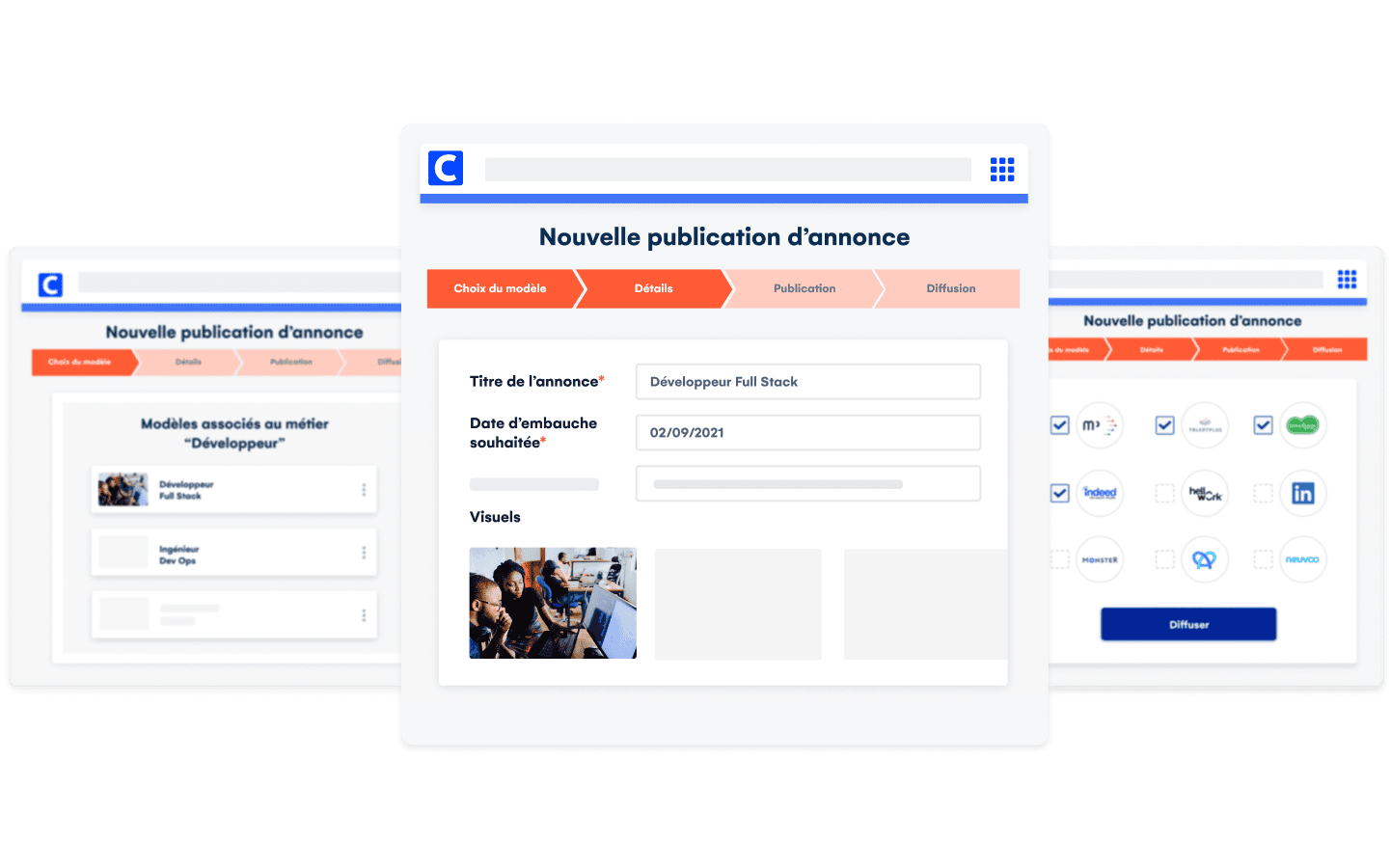Vos gestionnaires opérationnels ont désormais la main pour publier des offres d’emploi en seulement quelques clics. Choix du modèle d’annonce, type de poste, personnalisation, diffusion et partage vers des sites d’emploi. Publier une annonce est devenu un jeu d’enfant !
