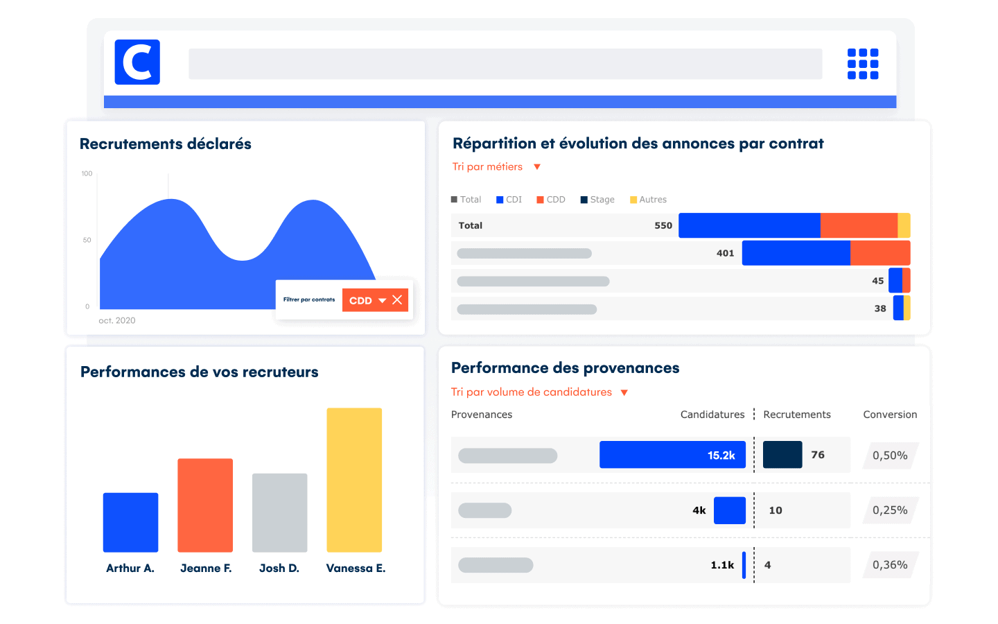 Obtenez des rapports complets pour piloter le recrutement, analyser la provenance des CV, la répartition par genre ou par type de contrat. Le module analytique vous offre une parfaite visibilité sur votre activité, sans oublier les leviers d’optimisation pour vos investissements et vos processus.