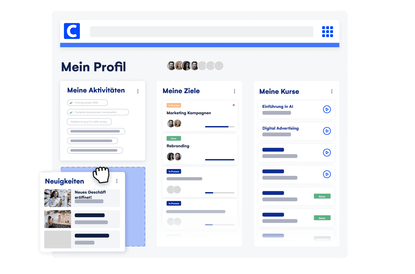 Da Weiterbildung im Banken- und Versicherungssektor im Mittelpunkt der Personalarbeit steht, können wir Sie bei der Entwicklung der Kompetenzen Ihrer Mitarbeiter unterstützen. Sie können maßgeschneiderte Trainingsprogramme erstellen, das Schulungsmanagement automatisieren, die Fortschritte Ihrer Mitarbeiter überwachen, Budgets verwalten und vieles mehr. Und das alles über eine einzige Schnittstelle.