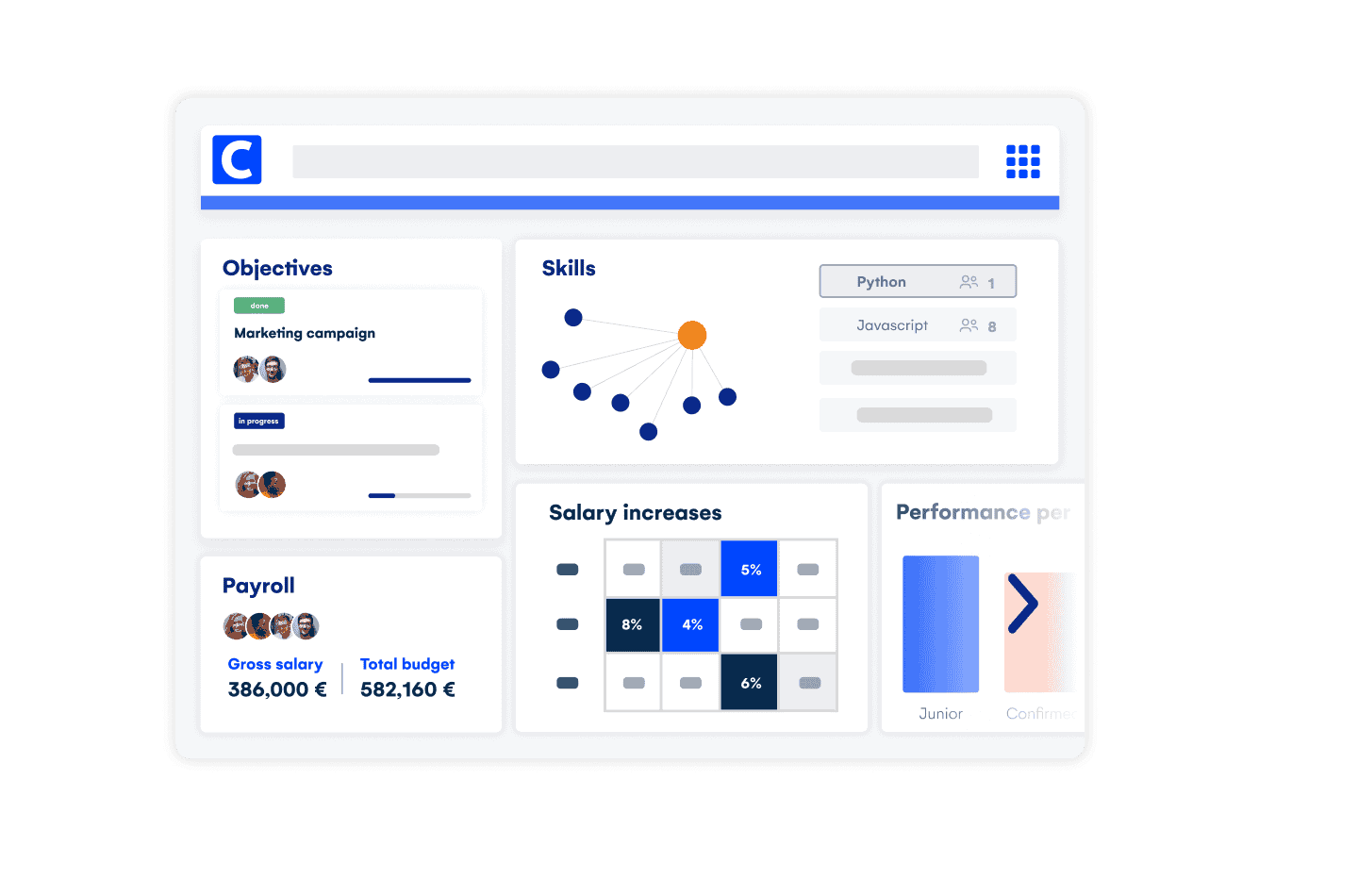 Nøgleindikatorer for evalueringsmål, tilpasning af præstation/løn, personlige træningsforløb, interne muligheder, mere flydende feedback osv. Alle disse funktioner hjælper med at optimere teamets præstationer. Resultatet er, at medarbejdernes engagement og faglige færdigheder forbedres, så de kan understøtte væksten.
