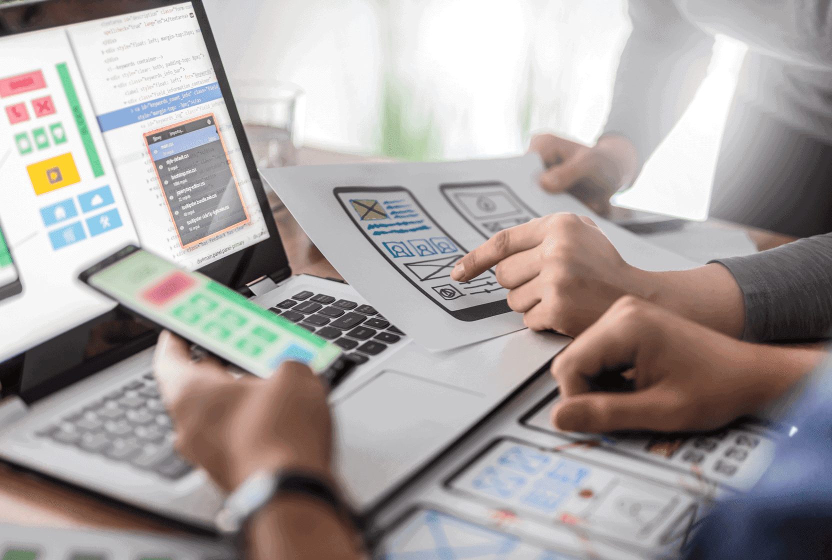 Derefter i idéfasen: vores teams gennemfører workshops med brugerne og designer sammen de elementer, der senere vil blive integreret i det fremtidige brugergrænseflade: hjemmesideskitser, navigationsmenuer, brugsscenarier…