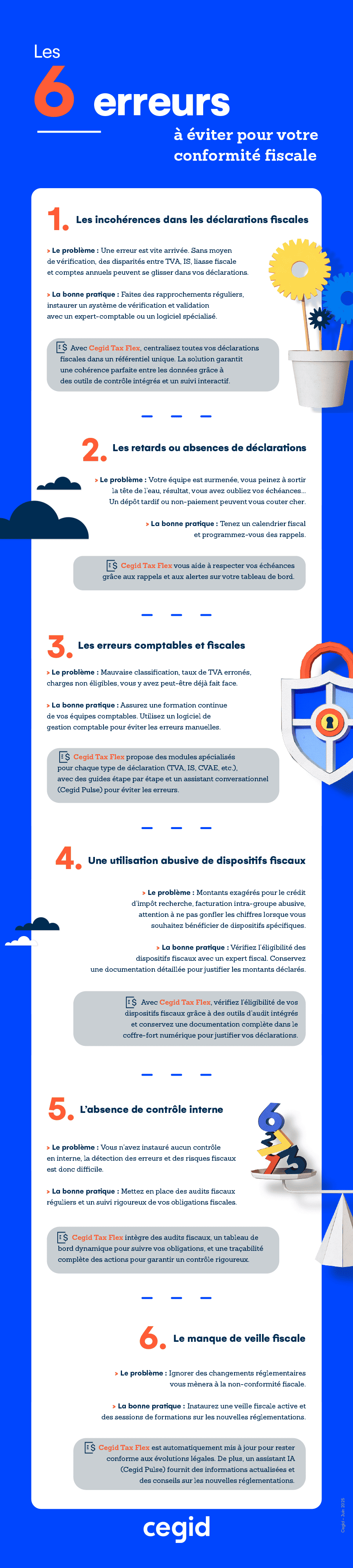Pourquoi ne pas choisir un logiciel qui anticipe les évolutions et vous guide pas à pas ? Découvrez sans attendre notre infographie pour découvrir les 6 erreurs à éviter absolument, et les atouts concrets d’une gestion fiscale comme Cegid Tax Flex.
