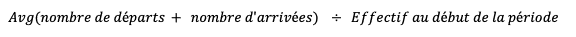 moyenne du nombre de salariés partis et du nombre de salariés arrivés durant une période prédéfinie, divisés par le nombre initial de salariés présents en début de période.