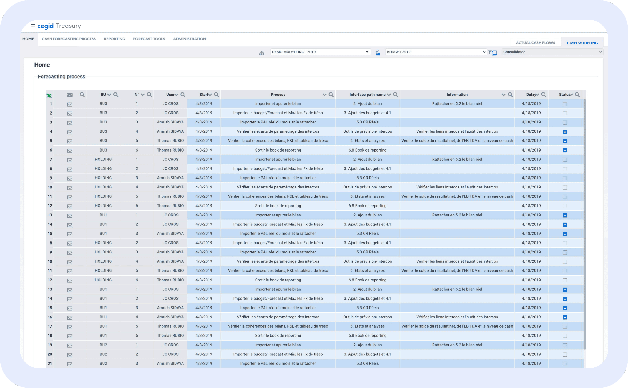Il apparaît donc plus aisé de commencer par la méthode directe, cela permet de sensibiliser à la culture cash plus rapidement. La solution Cash Forecasting de Cegid Treasury offre la possibilité de construire très vite des prévisions agiles sur 13 semaines à 12 mois. Vous pouvez la coupler avec un TMS, comme le module Cash Management de Cegid Treasury.