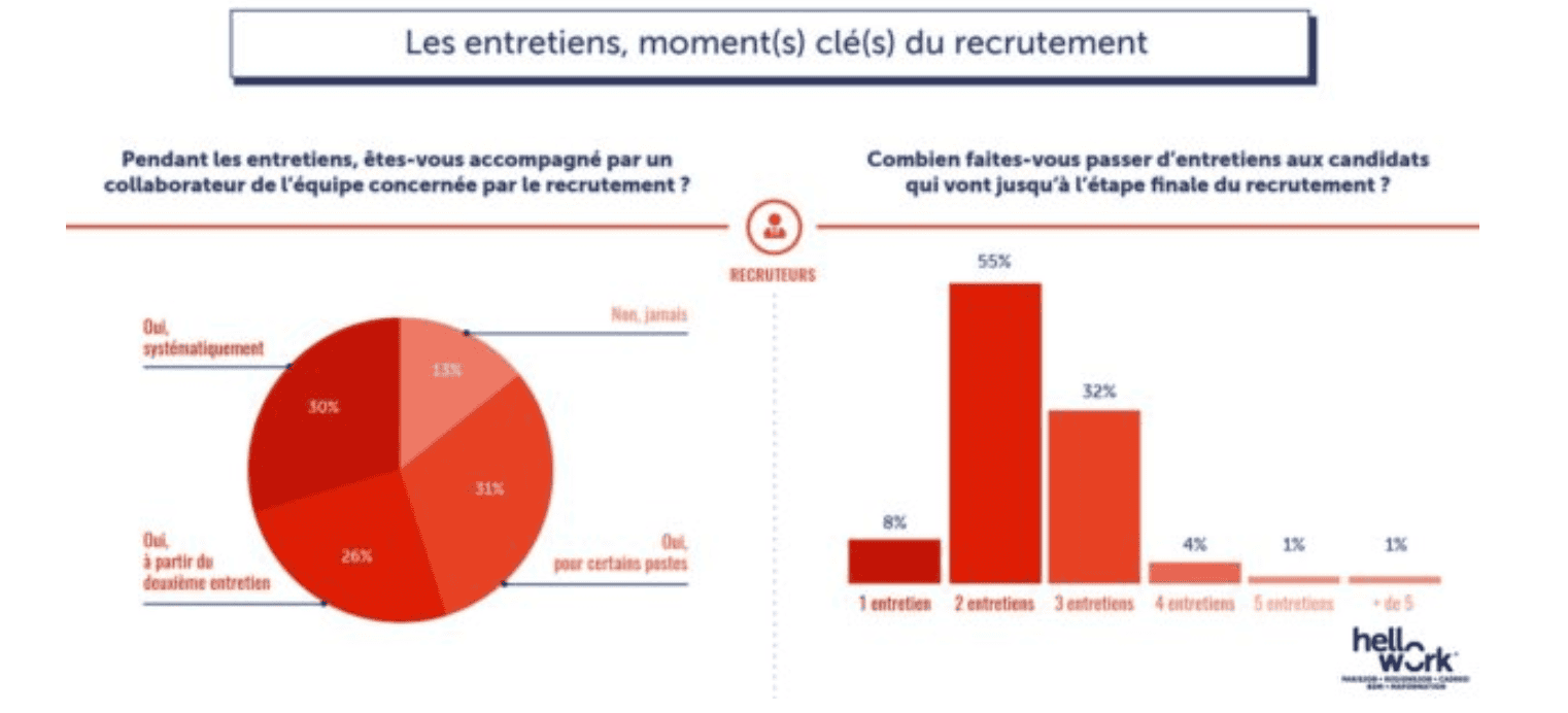 56% des recruteurs sont accompagnés en entretien par un membre de l’équipe concernée par le recrutement (Enquête « Le recrutement et la recherche d’emploi en 2019 », Régionsjob)