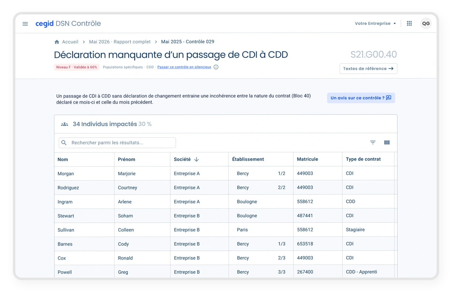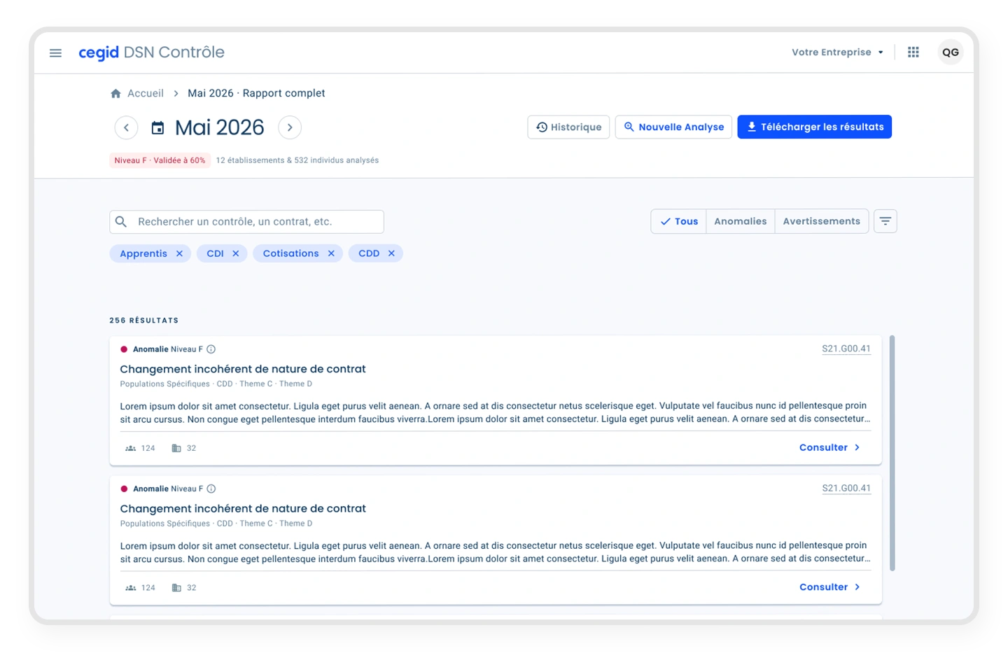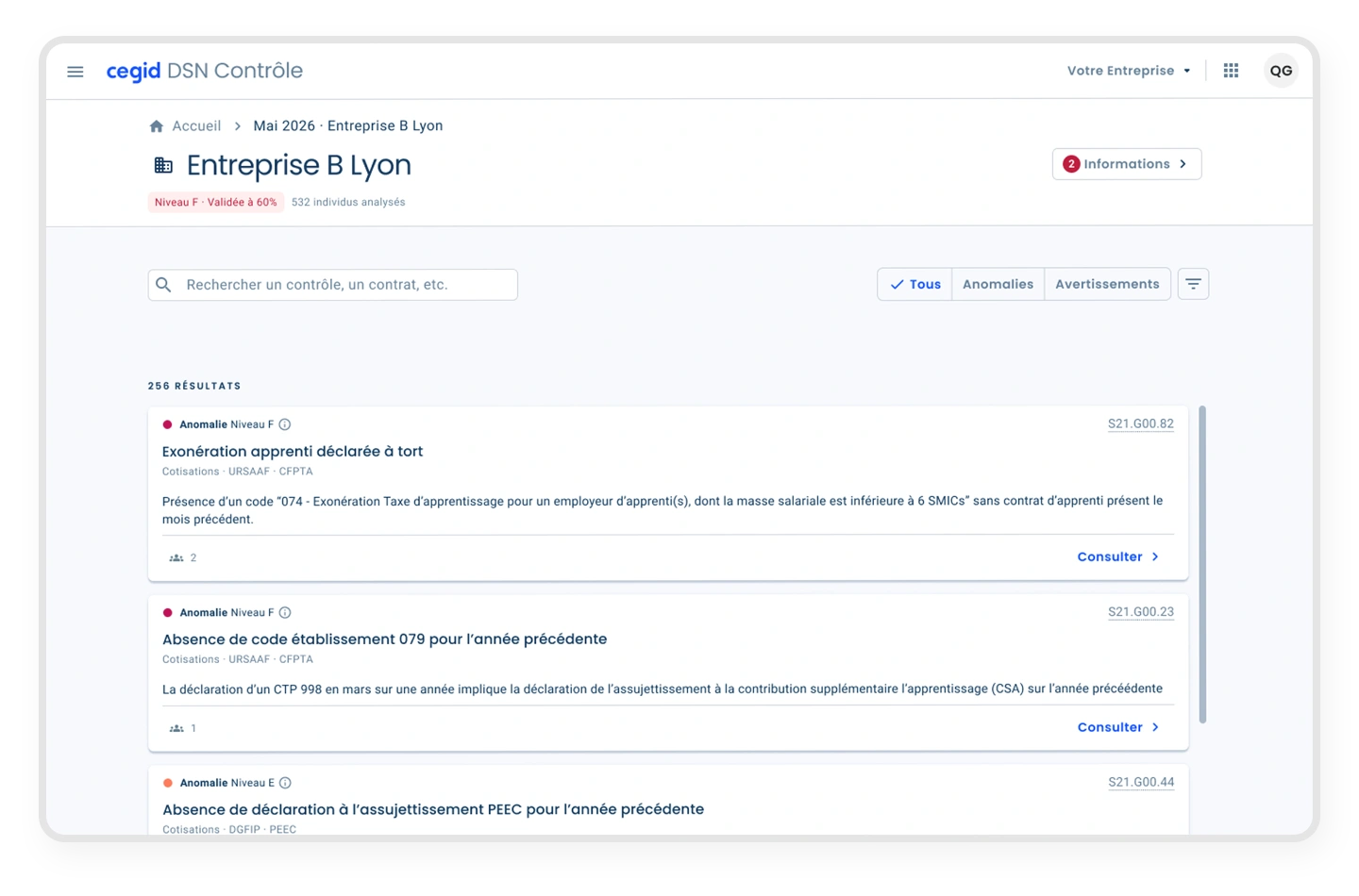 Retrouvez toutes les anomalies détectées sur une DSN dans une interface claire et exploitable.