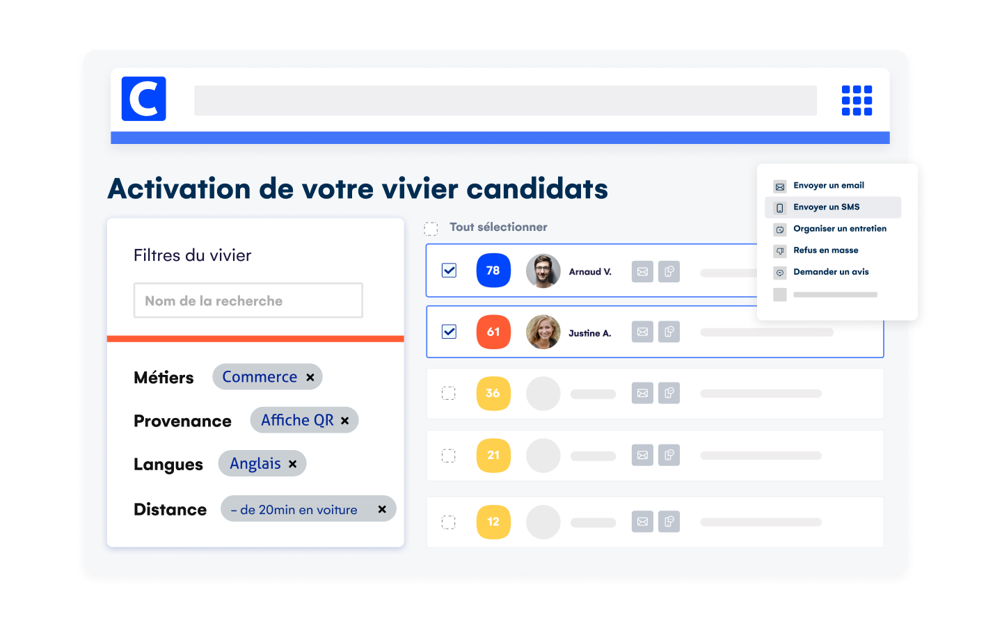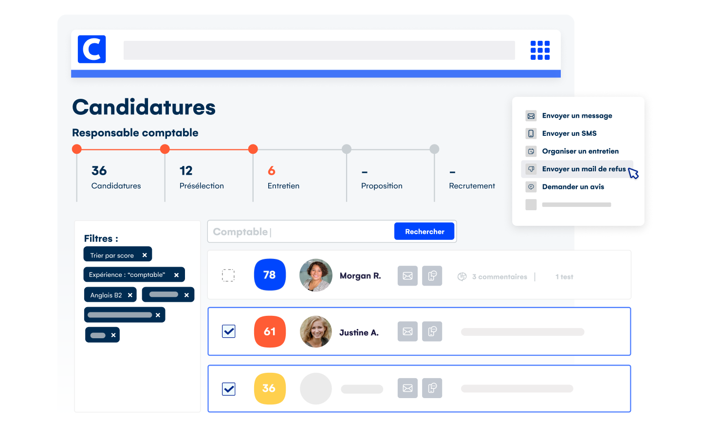 Gagnez du temps au quotidien avec nos nombreux outils dédiés à vous faciliter la tâche aussi bien dans le tri des candidats que dans la communication auprès de vos candidats. Parsing automatique des CV, questionnaires, intégration de scorecard, d’assessment, mais aussi envoi d’emails et SMS personnalisés en masse : tous vos filtres et actions sont à portée de clics !