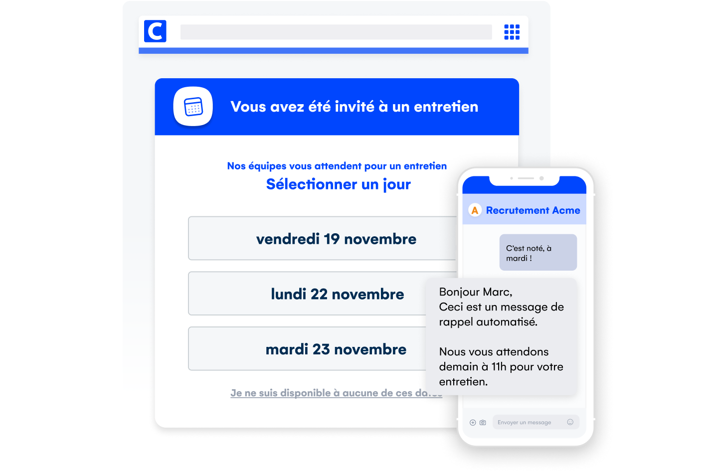 Arrêtez de perdre du temps dans l’organisation des entretiens ou la relance de candidats ! Le module Talent Acquisition fluidifie toutes ces étapes avec des solutions innovantes comme l’entretien en self-service connecté aux agendas des recruteurs ainsi que les rappels automatiques auprès de vos candidats.