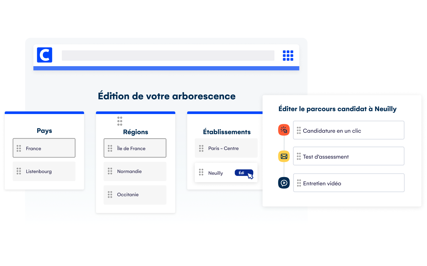 Modélisez votre organisation directement dans Talent Acquisition et activez en quelques clics des parcours candidat personnalisés selon chaque entité, chaque poste et chaque bassin d’emploi. Dans chaque contexte, notre logiciel de recrutement vous permet de définir les informations requises pour postuler. Configurez votre questionnaire de sélection et proposez le bon format d’entretien (physique, vidéo live et différé).