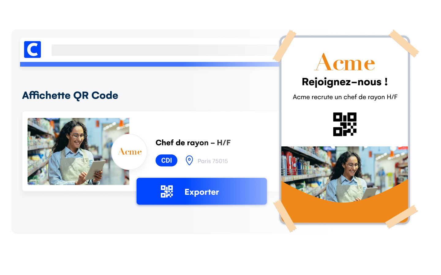 Vos candidats déposent des CV dans vos établissements ou magasins ? Digitalisez-les et exploitez-les avec Talent Acquisition. En un simple clic, vos annonces sont exportées en affichettes QR Code. Les candidats postulent à vos offres d’emploi, comme s’ils étaient derrière leur ordinateur.