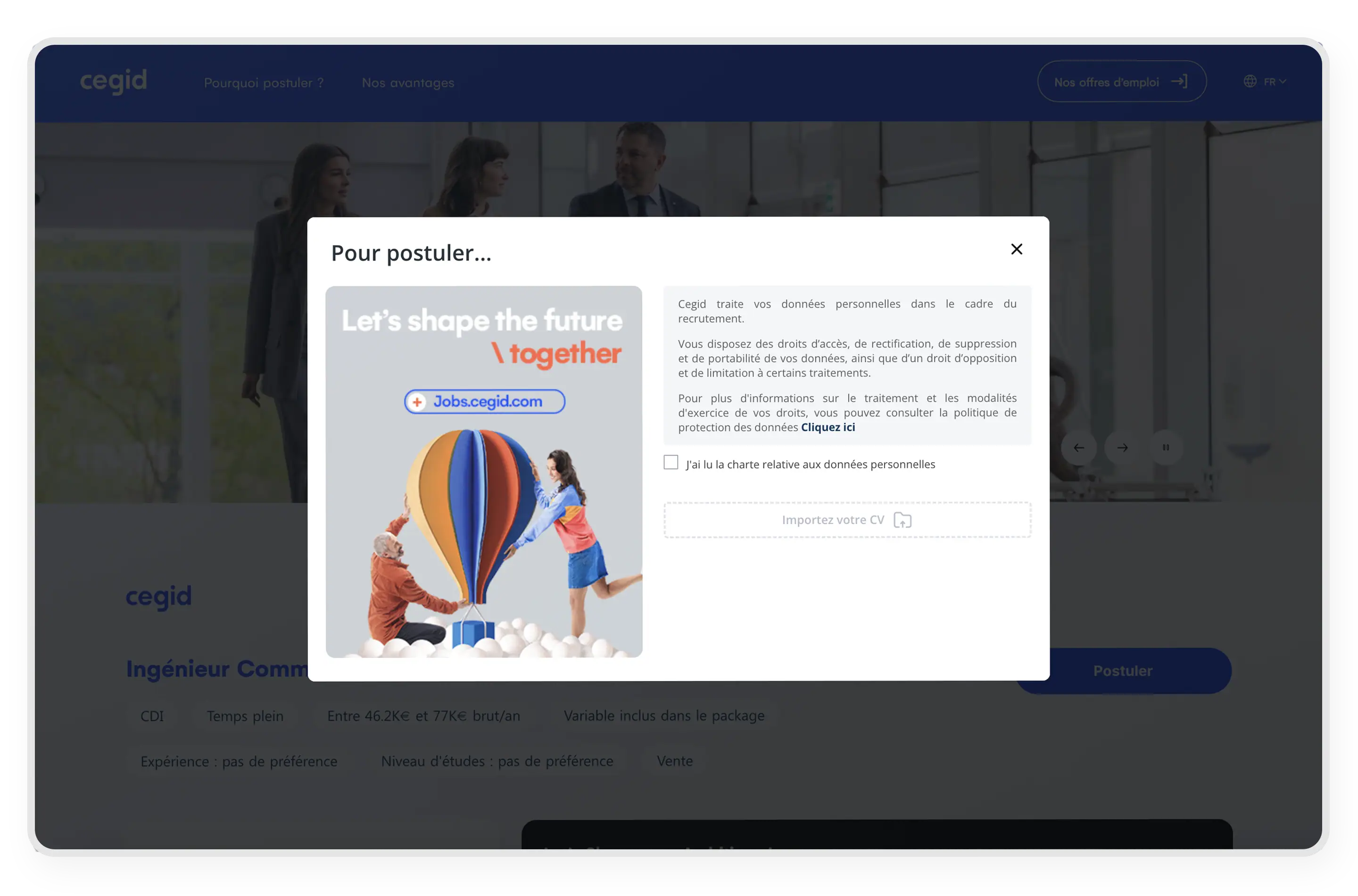 Créez en quelques clics une vitrine à votre image, qui attire, séduit et convertit les bons candidats. Avec Cegid HR Talent Acquisition, valorisez votre marque employeur et offrez une expérience candidate unique, fluide et personnalisée.