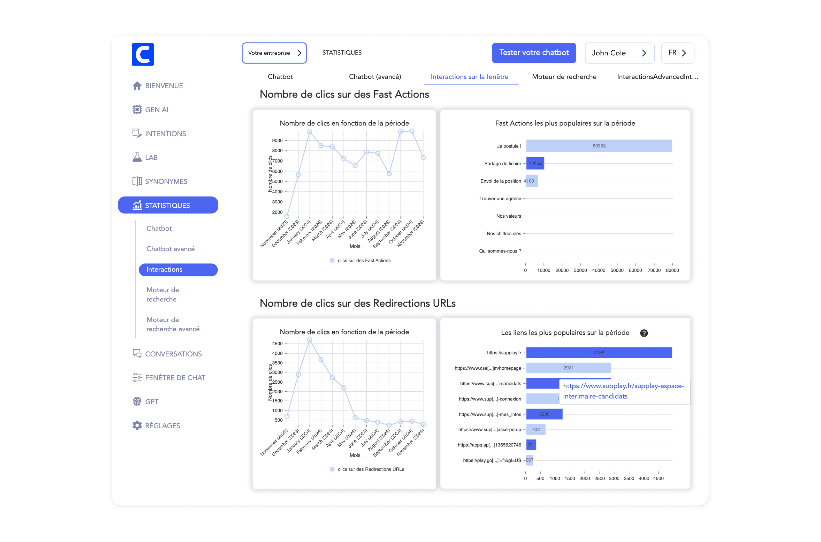 À chaque interaction avec les candidats, le chatbot RH apprend de ses erreurs. Appliquez ses suggestions, pilotez les modifications et suivez leurs impacts dans des tableaux de bords analytiques complets. Votre assistant virtuel évolue grâce à ses nombreuses fonctionnalités. L’expérience candidat s’améliore de jour en jour.