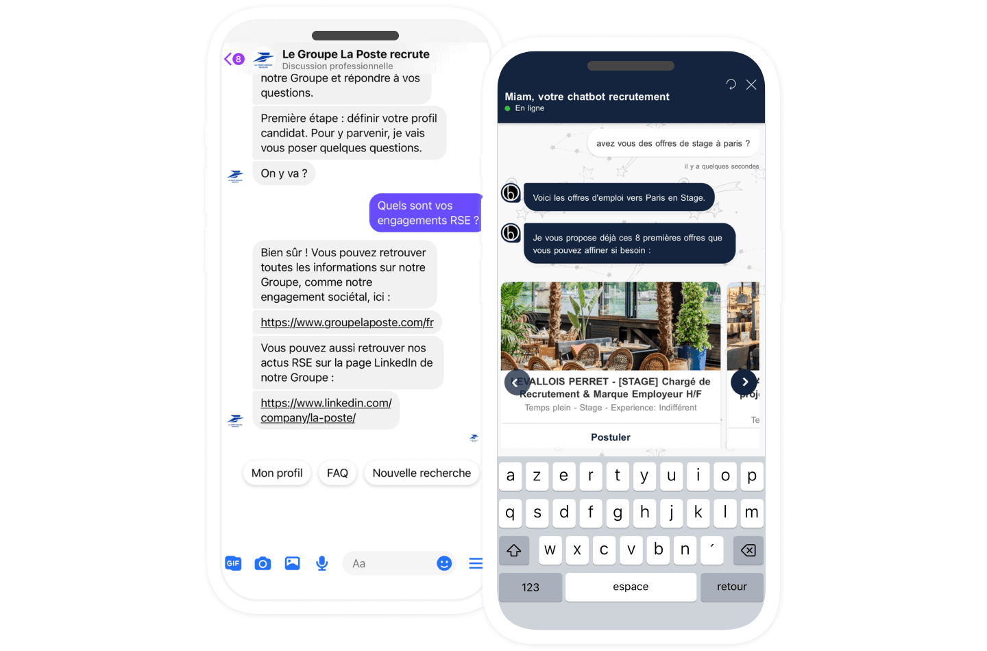 Au-delà des communications avec les candidats sur votre site carrière, votre chatbot RH s’inscrit dans vos processus de recrutement. Grâce à l’Intelligence Artificielle, vous utilisez le scoring personnalisable et la programmation automatique d’entretiens 24/7. Résultat : le volume et la qualité des candidatures augmentent.