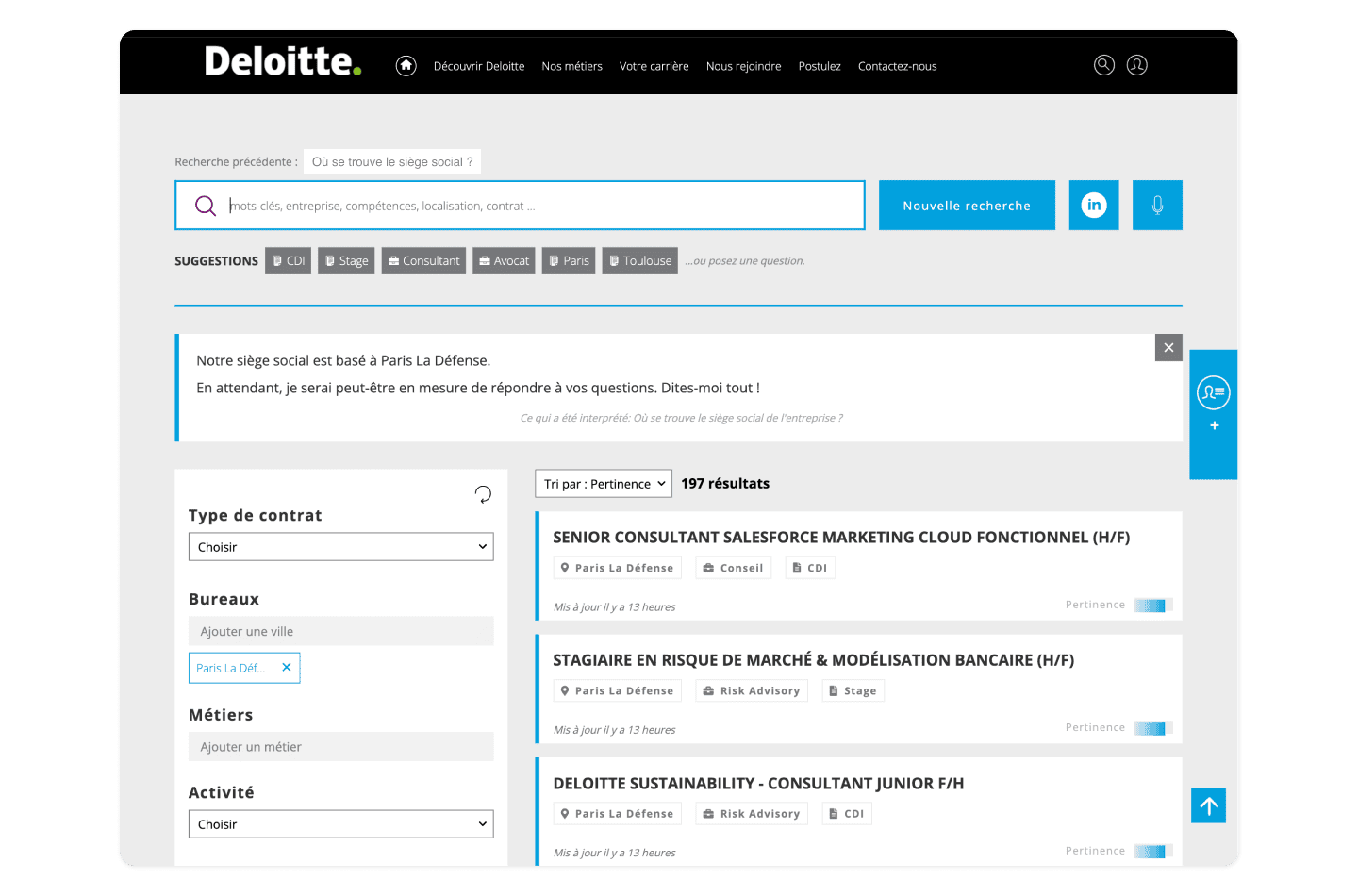 Avec l’intégration d’un agent conversationnel, le moteur de recherche agit comme un véritable chef d’orchestre. Il répond à toutes les questions. Et ce, à tout moment. Les candidats sont mieux ciblés et postulent pour les bonnes raisons. Les entreprises améliorent leur marque employeur.