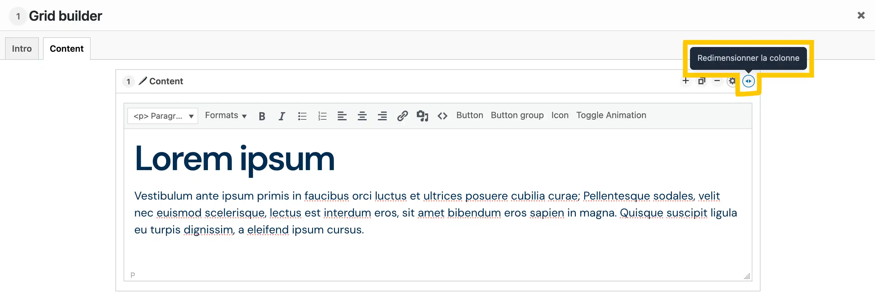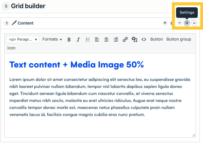 Le composant grid builder permet d’intégrer du contenu wysiwyg, des médias, un form et même ajouter une colonne vide en guise de marge / espace de respiration dans une seule et même section.