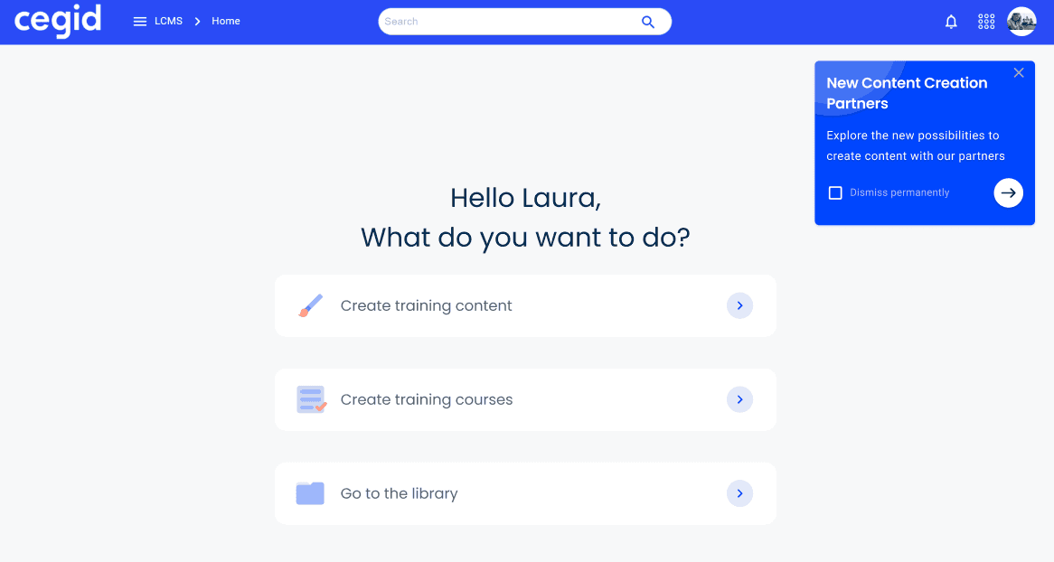 The way it works is simple: you can take out a contract with any of the providers, and we activate a technical connection within the module for a simplified user experience. Our Cegid HR LCMS remains your point of entry for content creation and for creating training courses which can then be published using the Cegid HR LMS.