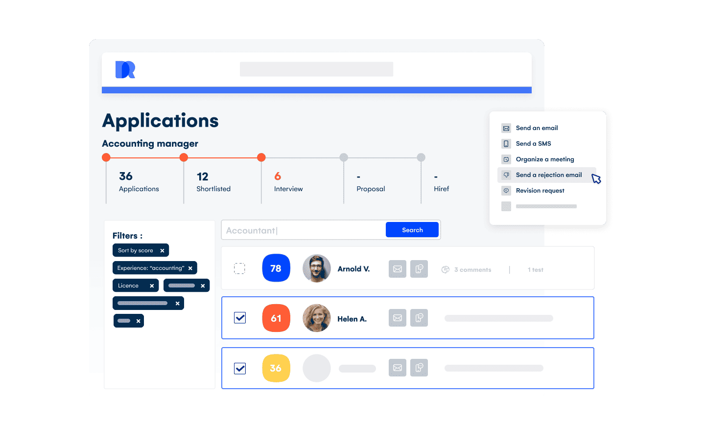 Save time on a daily basis with our many tools dedicated to making your work easier, both in sorting your candidates and in communicating with them. Automatic parsing of CVs, questionnaires, scorecard and assessment integration, but also bulk sending of customised emails and SMSs: all of your filters and actions are just a click away!