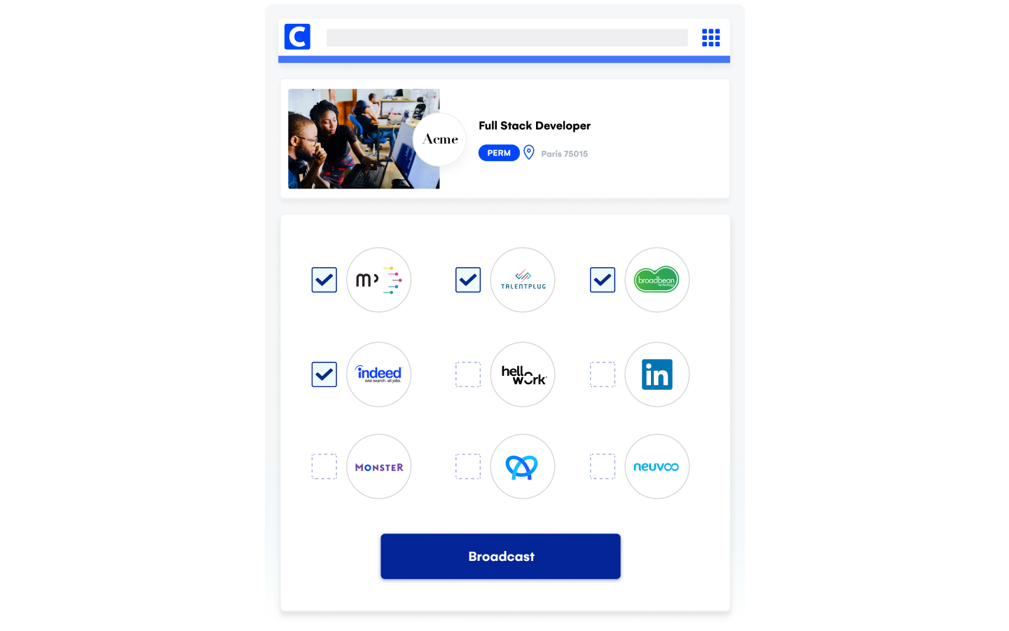 Your operational managers can now publish job offers in just a few clicks. Job ad template selection, job type, personalization, distribution and sharing to Indeed, LinkedIn over 3,500 job boards. Posting a job ad is now a piece of cake!