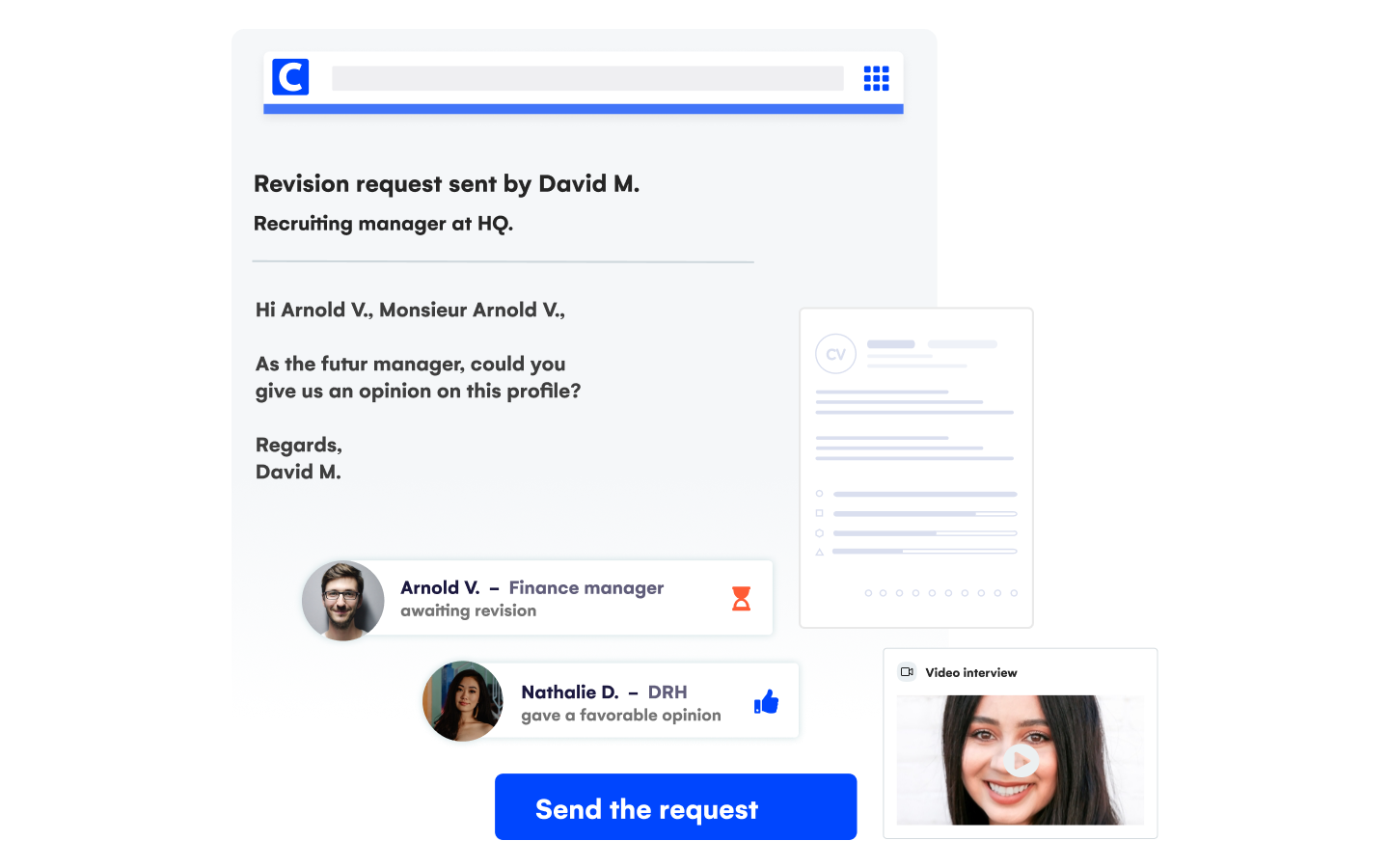 Solicit the people involved in a recruitment process, share your comments, video interviews or tests with them, and speed up the decision-making process. Every communication is centralized and accessible so everyone can move forward as one. Best of all, you don’t even need an account – simply share via email.