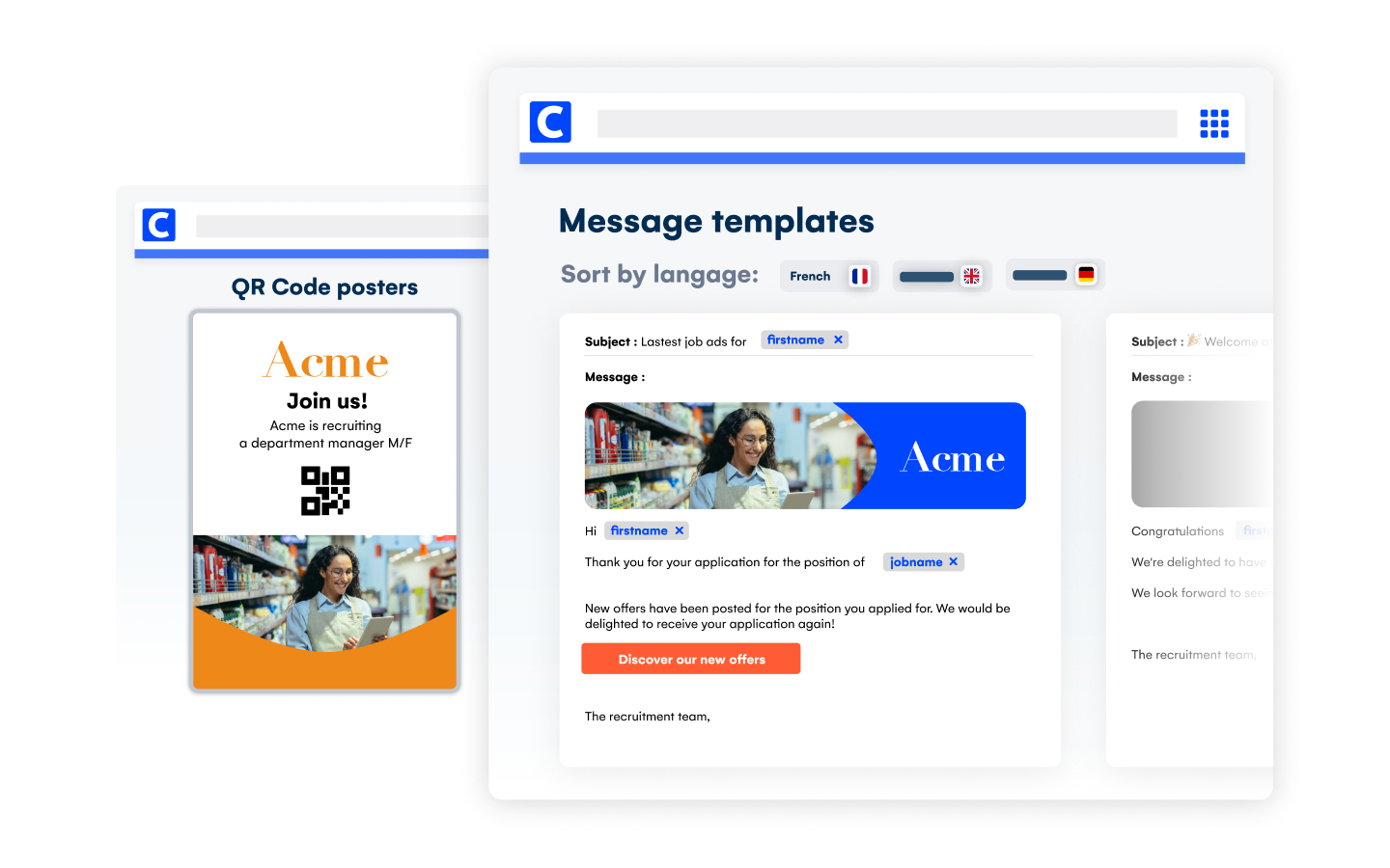 Address your candidate segments across all media: email, offline, targeted advertising (with our partners native integrations). Send personalized marketing emails to targeted segments, create QR code posters for local recruitment or at events and meetups.