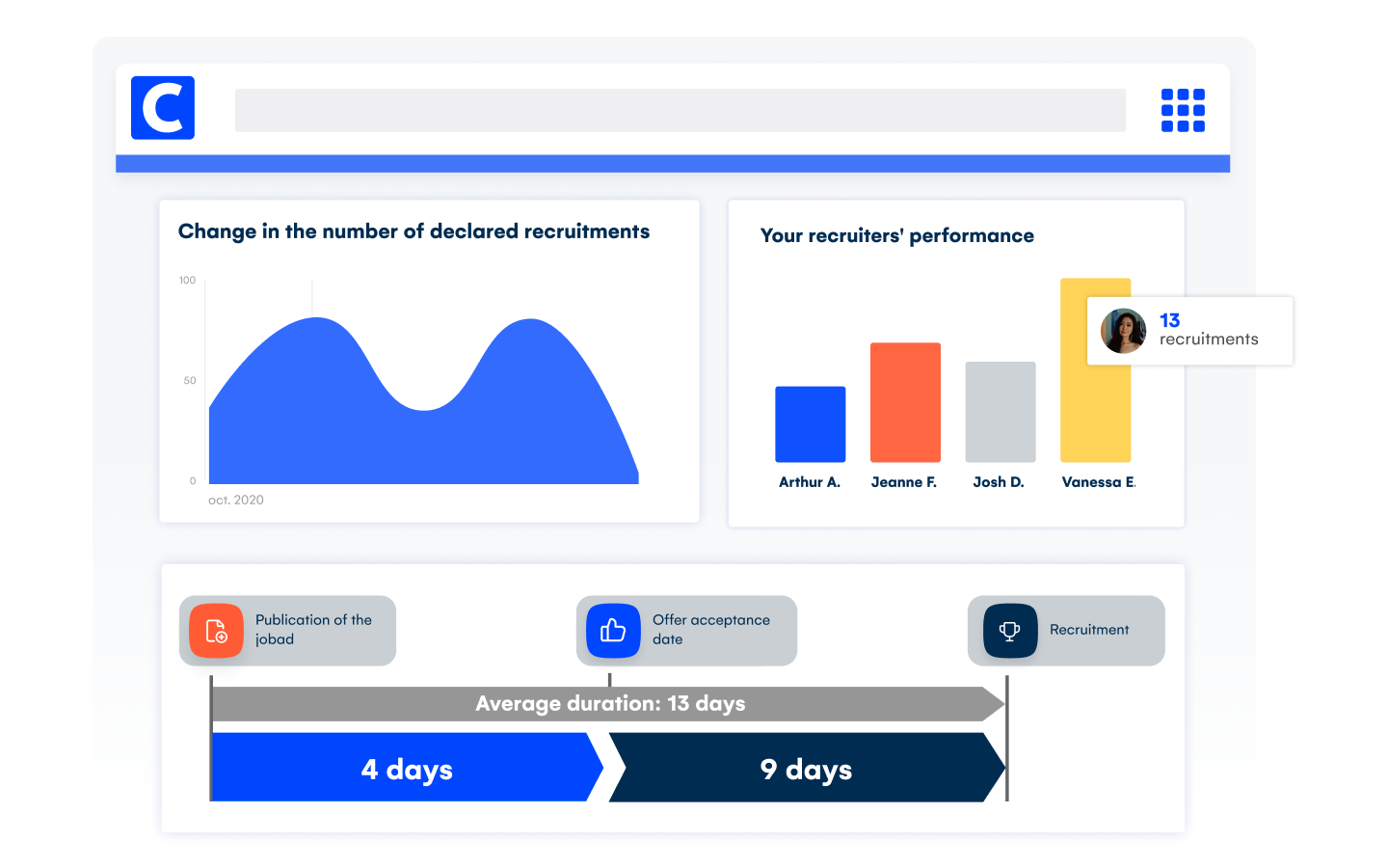 Get comprehensive reports to monitor recruitment, analyze the origin of resumes, and breakdown by gender or type of contract. The analytics modules give you full visibility of your business, and provide levers for optimizing your investments and processes.