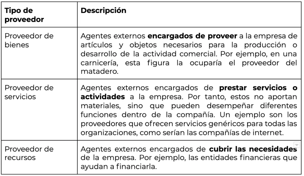 Cualquier empresa depende del sector en el que esté desarrollando su actividad y la naturaleza del mismo. Además, la gran mayoría requiere la participación de agentes externos, los cuales se integran dentro de la cadena de producción y comercialización de los productos o servicios y engrosan la cuenta de proveedores.