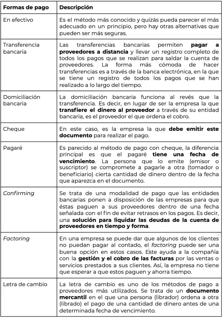 Existen diferentes formas de pago para liquidar las deudas de la cuenta de proveedores. En el siguiente cuadro se pueden encontrar las más comunes: