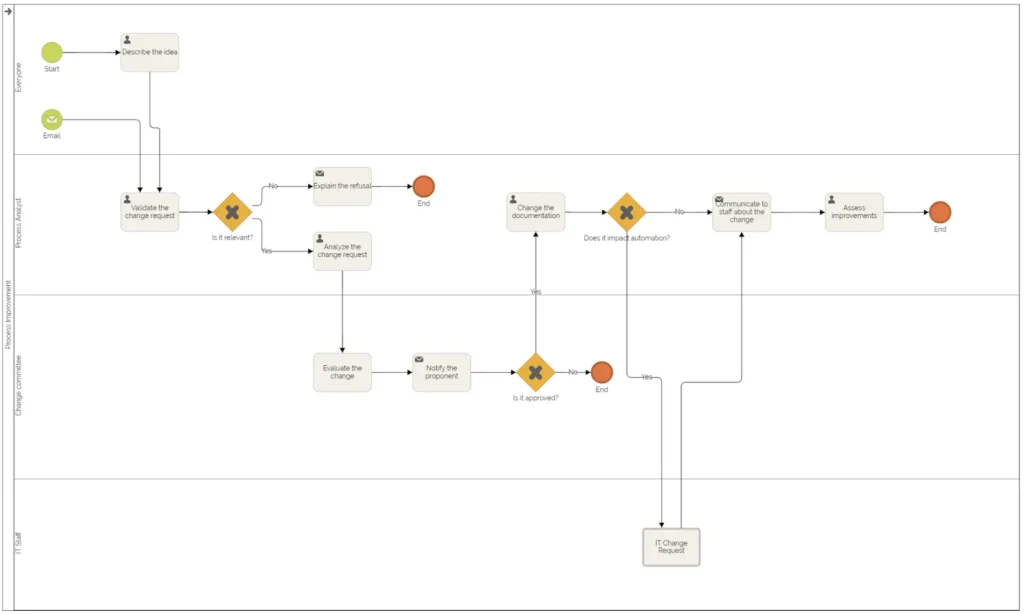 Seguidamente, un ejemplo de mejora de los procesos en el que se incluyen desvíos, tipos de eventos iniciales, instancias, usuarios y otras informaciones: