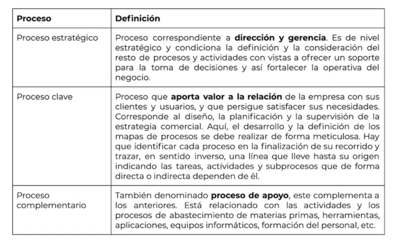 - Establecer los procesos estratégicos. Los procesos estratégicos son todos aquellos que hacen referencia a la dirección de la empresa: marketing, nuevos productos, contabilidad, etc.