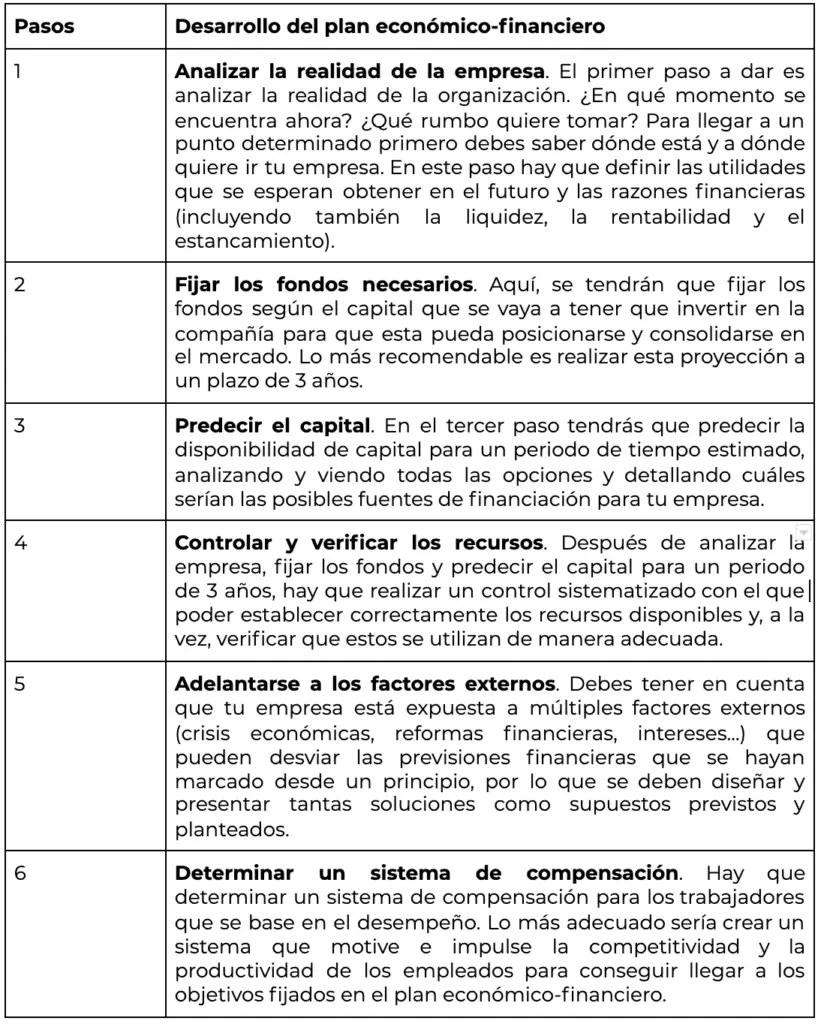 La parte más compleja a la hora de realizar un plan de negocio es hacer el plan económico-financiero. Aún así, es necesario que se elabore de la forma más realista y objetiva posible. En la siguiente tabla se establecen los pasos básicos a seguir.