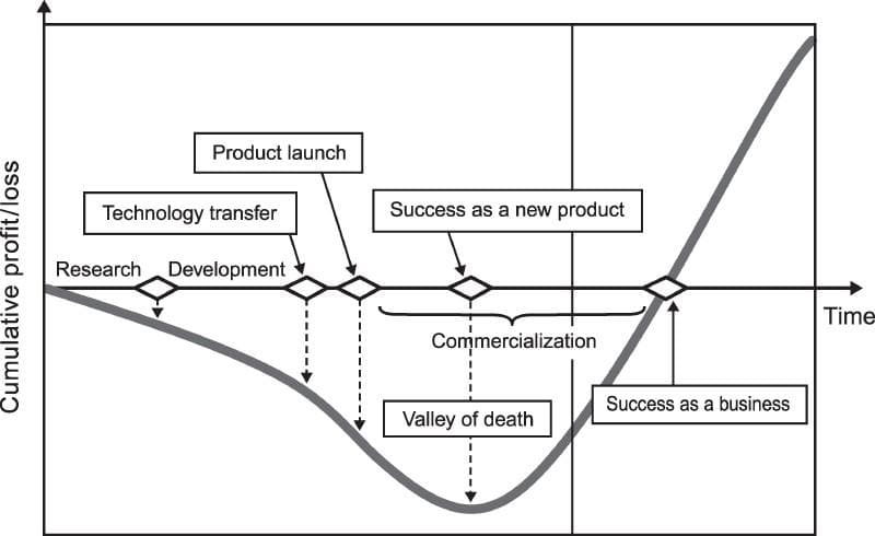 Resulta evidente que, cuanto más tiempo transcurra desde el momento de lanzamiento hasta alcanzar el éxito del nuevo producto, mayor será la profundidad del denominado valle de la muerte. Esto aumentará las necesidades de financiación y, por consiguiente, el riesgo de todo el proyecto.