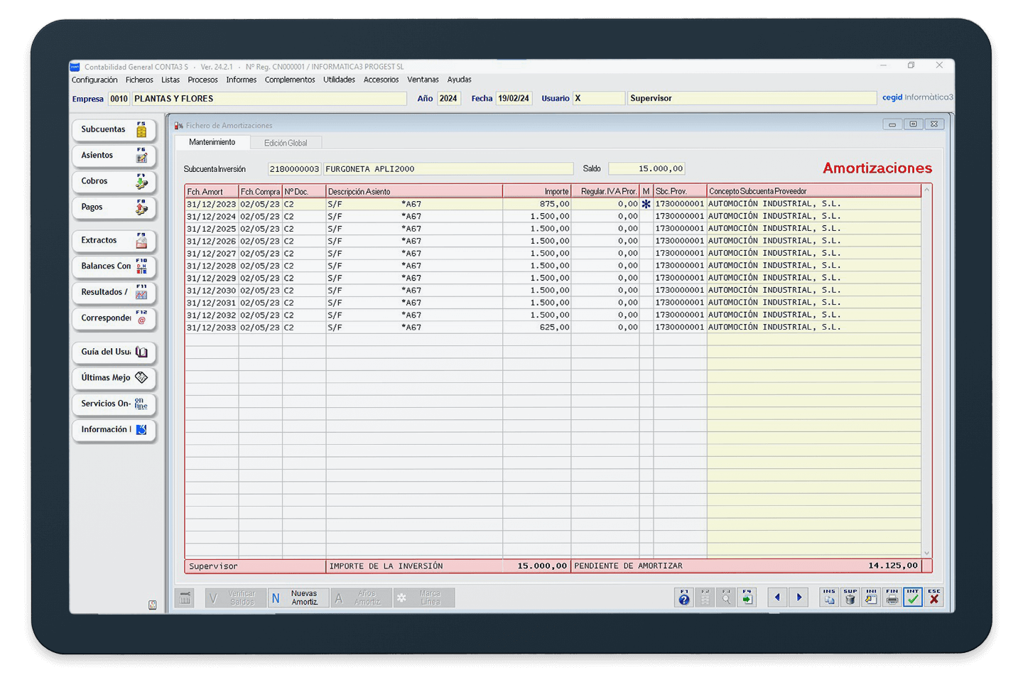 Controla el plan de amortización del inmovilizado material e inmaterial de tu empresa. Podrás controlar las inversiones pendientes de amortizar y las amortizaciones del ejercicio, las que podrás contabilizar de manera automática con periodicidad anual, trimestral o mensual.