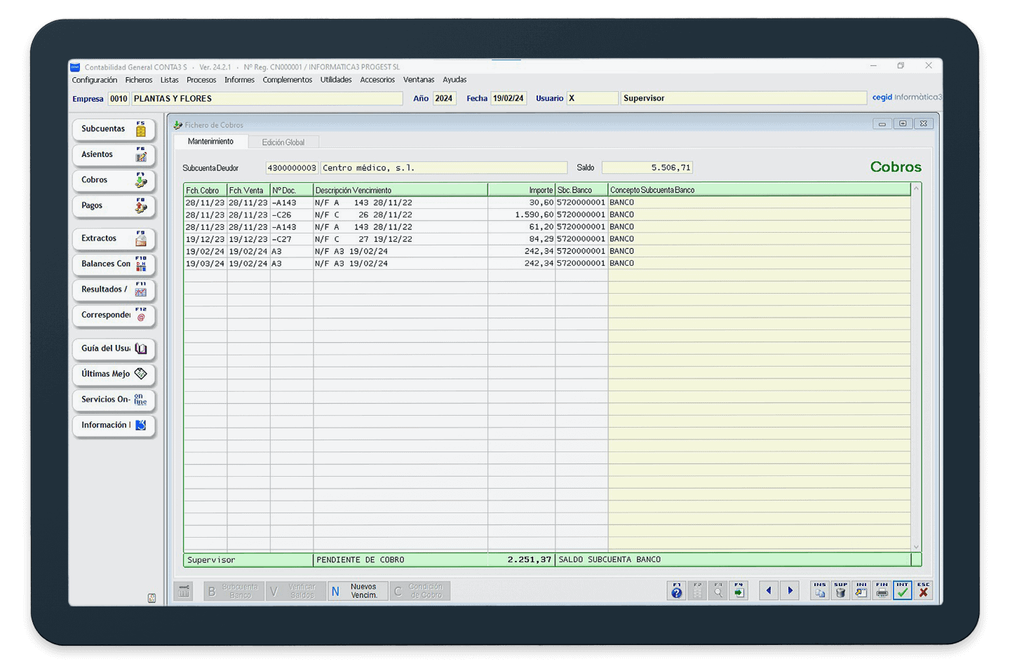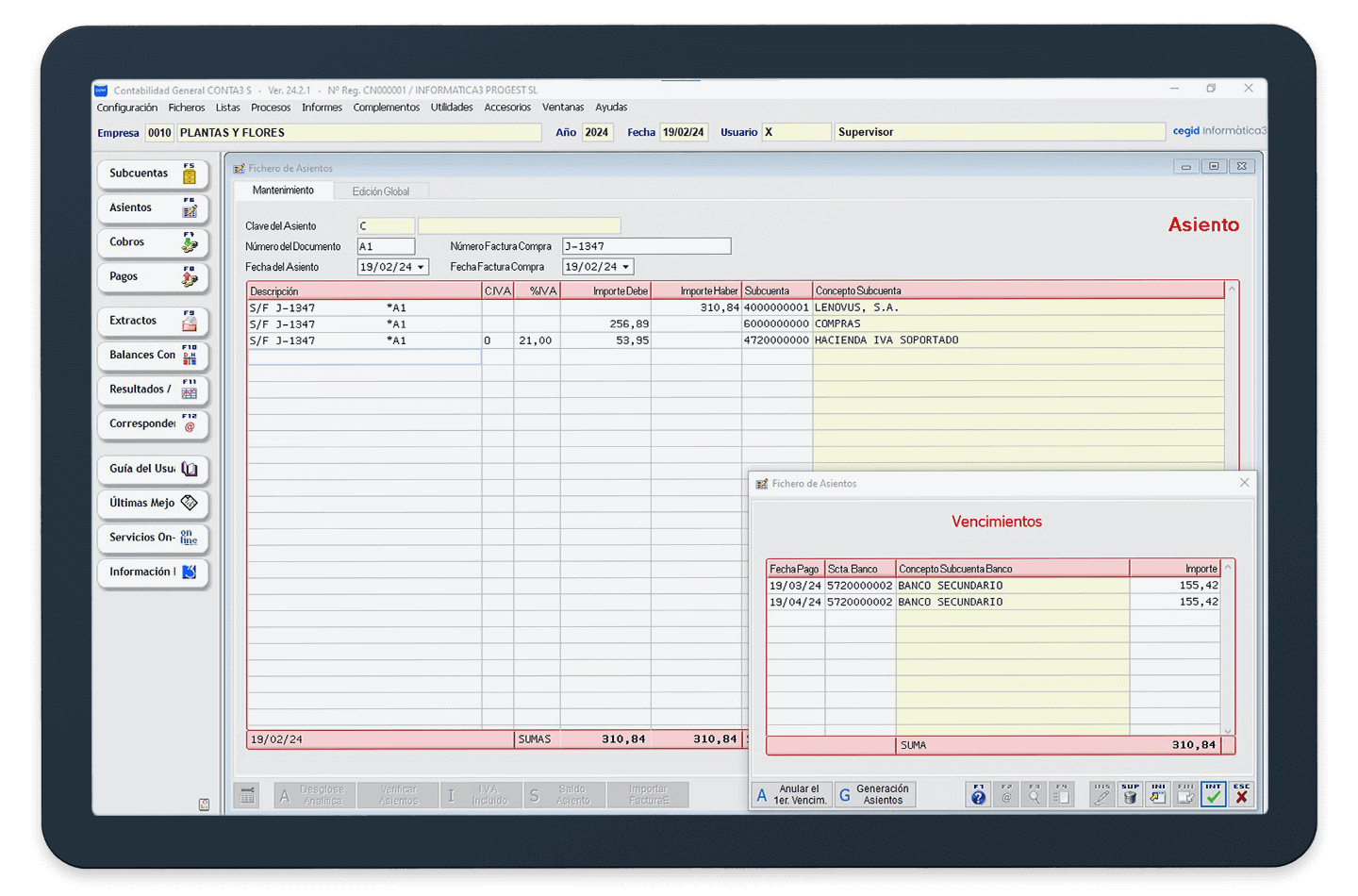 Con la entrada de los asientos podrás grabar los vencimientos de cobros y pagos, pudiendo, de este modo llevar un control y una previsión de cobros y pagos, riesgo bancario y riesgo de clientes, la previsión virtual de tesorería y también contabilizarlos.