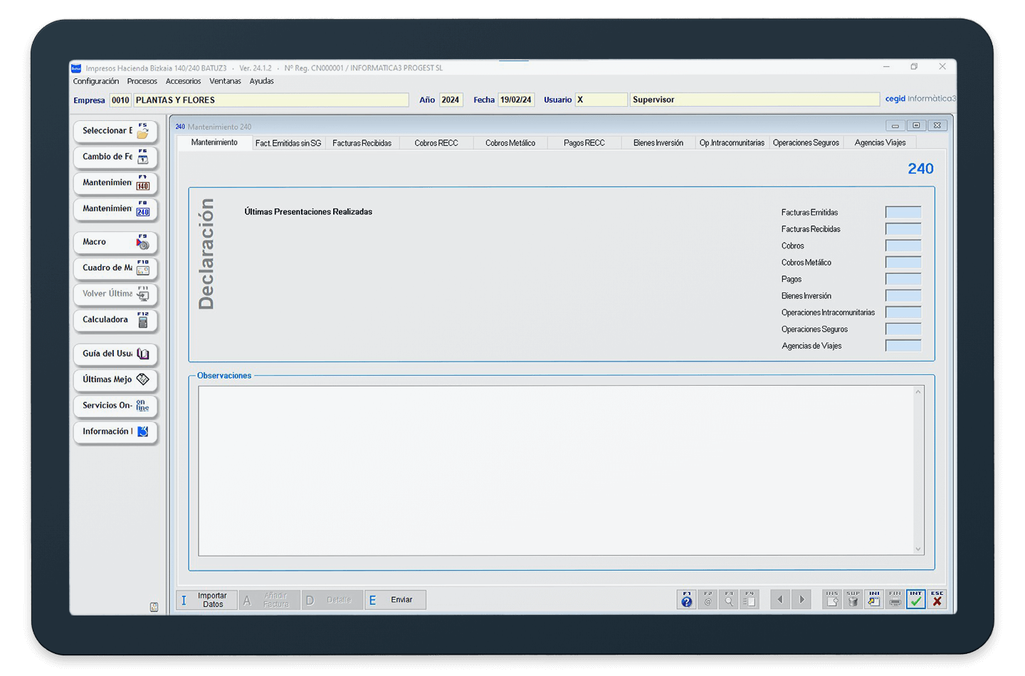 Cegid Conta3 se complementa con los programas de gestión Cegid Gesco3, Cegid Hotel3, Cegid Terven3, Cegid Resta3 para cumplir con las obligaciones fiscales de envío de los modelos 140 y 240 en el formato de Libro Registro Electrónico instaurado por el proyecto Batuz en la Diputación de Bizkaia.