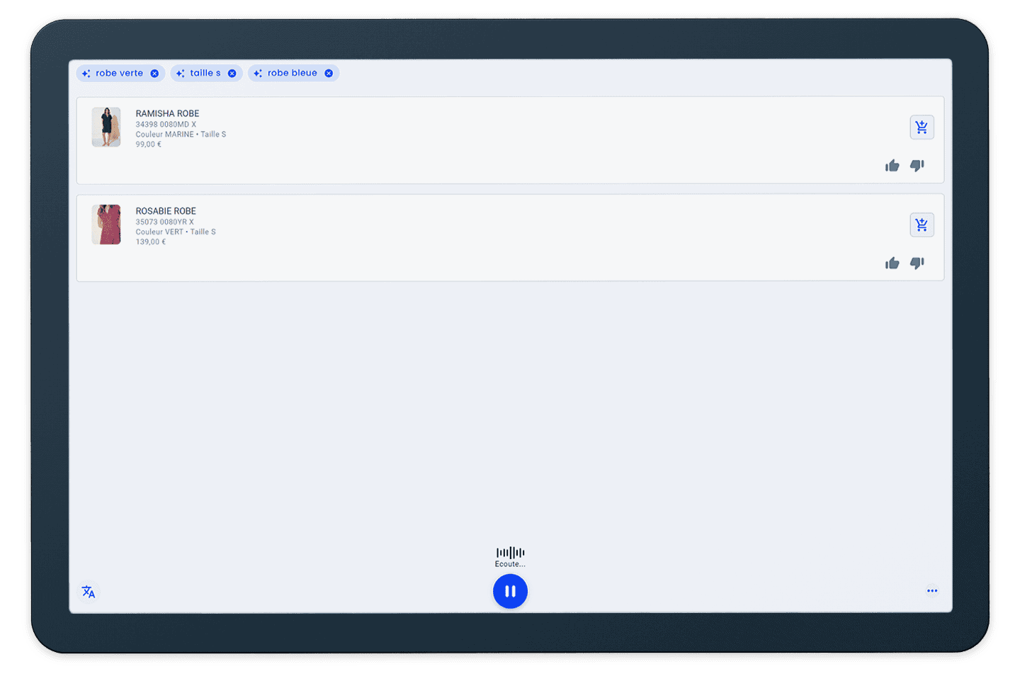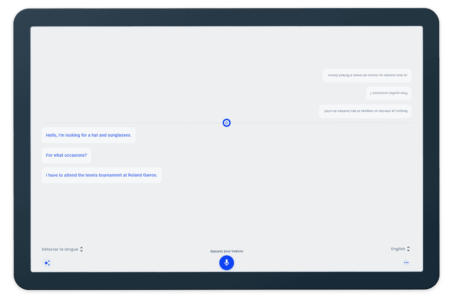 Comuníquese a la perfección con los clientes internacionales mediante un traductor instantáneo basado en IA. Esta herramienta, disponible en el dispositivo del empleado de la tienda, facilita el intercambio y la interacción en tiempo real con clientes de todo el mundo.