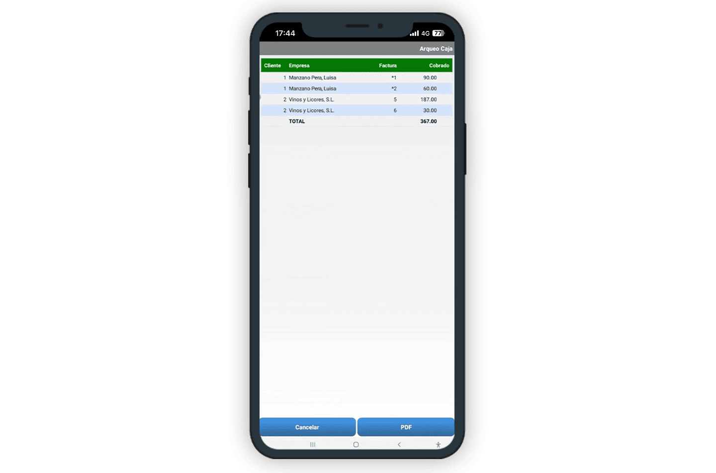 Cegid Vendir3 te permite realizar un arqueo de caja con el resumen de los importes cobrados durante el día. Además podrás exportar a PDF el resumen de caja, donde verás con detalle para cada cobro realizado el número de cliente, el nombre de la empresa, el número de la factura y el importe cobrado.