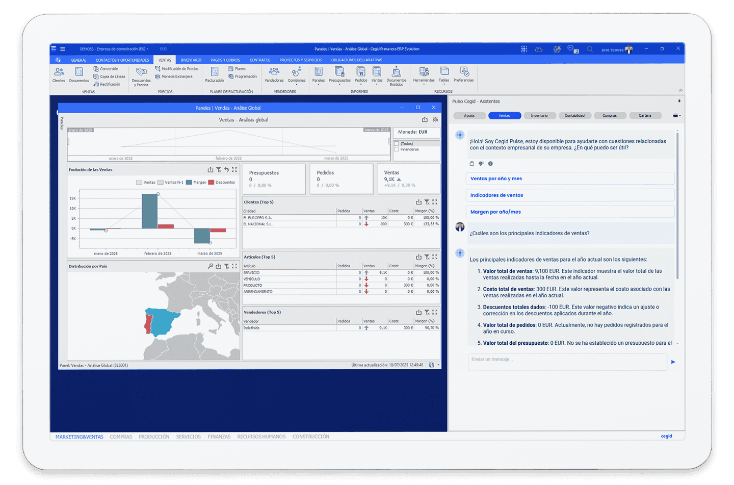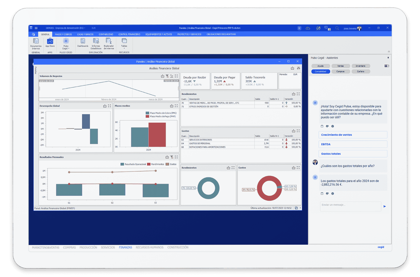 Cegid Pulse utiliza la amplia información de la empresa para simplificar los procesos y facilitar las tareas diarias. Esta herramienta ofrece asesoramiento basado en la información de Cegid Evolution ERP, alerta sobre posibles problemas y sugiere medidas para resolverlo.