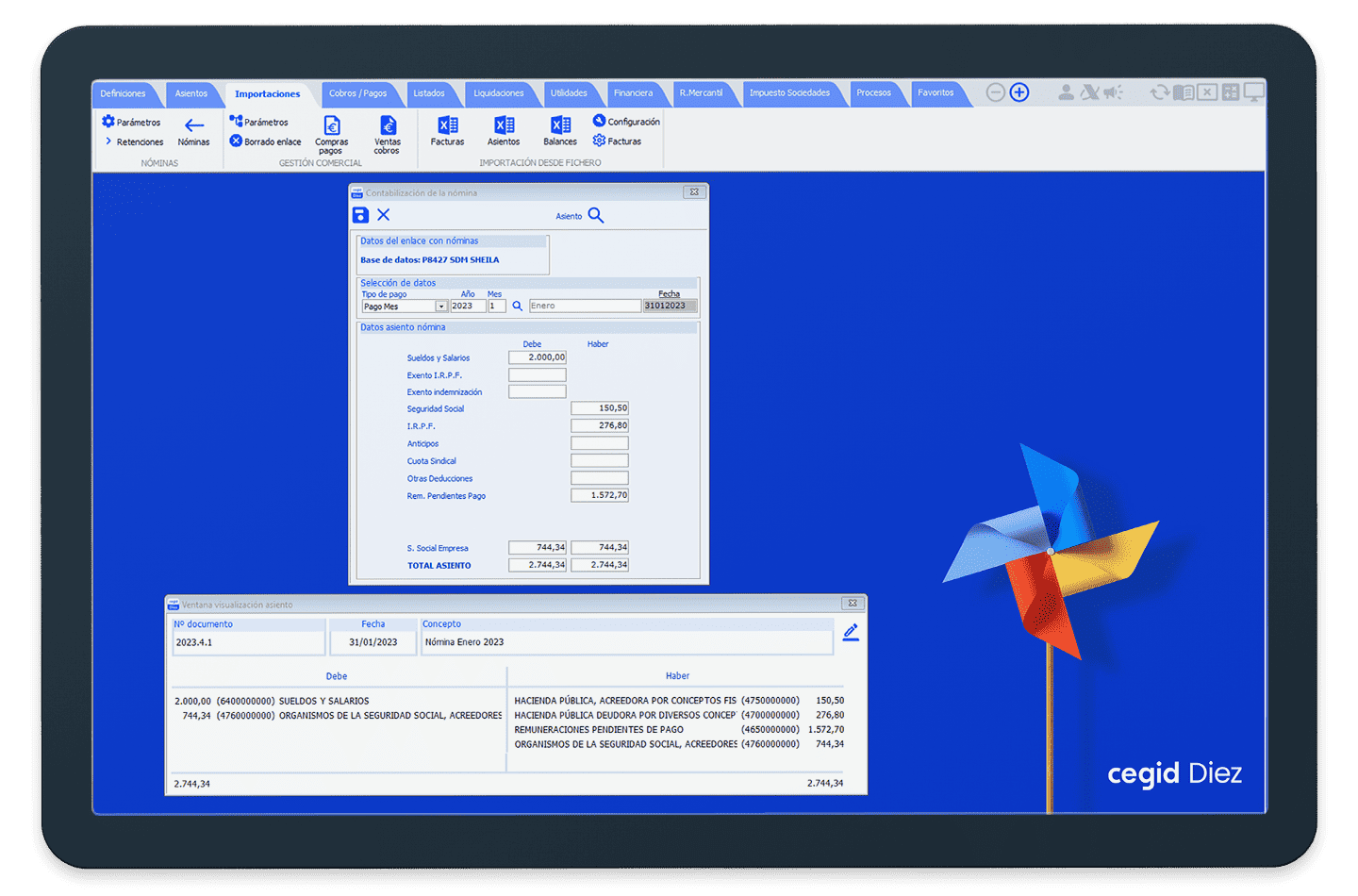 Automatiza más procesos al conectar tu software de contabilidad con Cegid DiezNOM y Cegid DiezFac. Exporta los datos para contabilizar el coste de las nóminas y contabiliza de forma automática facturas, remesas, cobros y pagos.