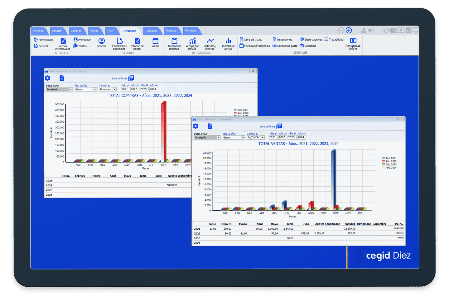 Con Cegid DiezFAC puedes obtener estadísticas de evolución, control de riesgos, importación de tarifas. Gracias a este programa de facturación para pymes o para autónomos puedes tener todas las gráficas necesarias para controlar tu facturación, disponibles en un único lugar. Es una manera muy sencilla de optimizar tus ventas.